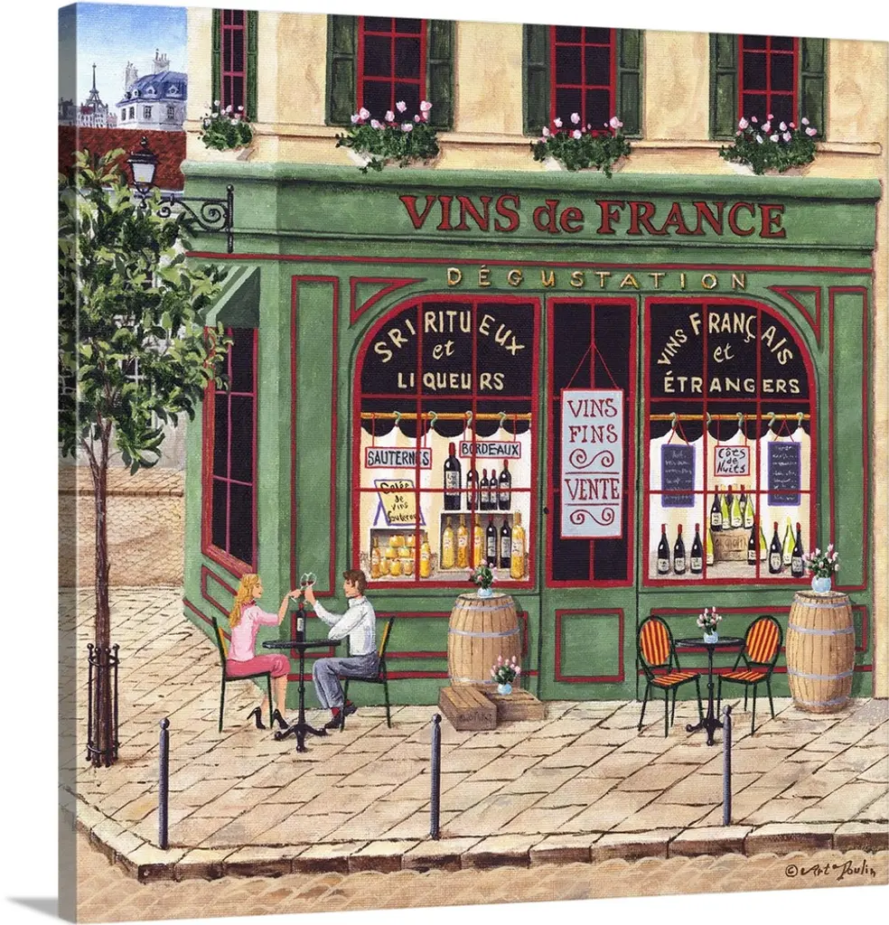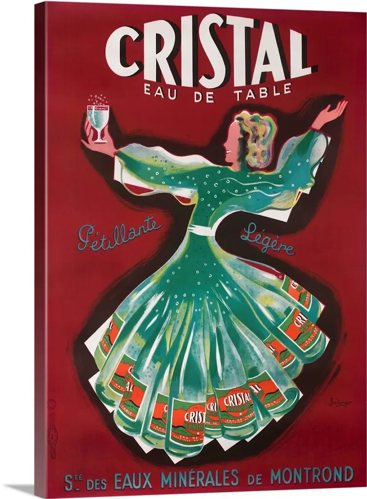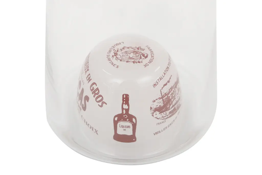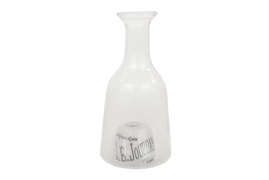 A pair of French bistro glass carafes with punts. Print reads in red on the front ���Vins & Spiriteuex en GROS, en Futs et en Bouteilles E.LUCAS Orion Vins Blancs de Choix". On the other side is an image of a factory framed with "Installation Toute Moderne France Vielles Eaux-de-Vie des Meilleurs Crus". The punt is printed with "Fabrication de Liqueurs Surfines" around a depiction of a wooden shield carved with a cross, topped in a hat and framed with a wreath. Dimensions per carafe.