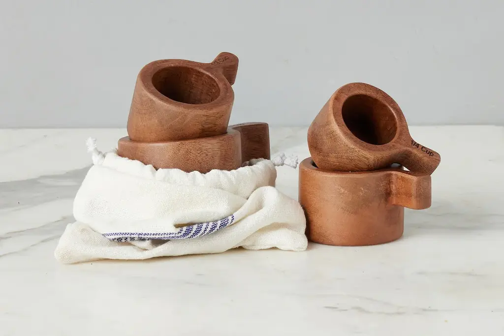 Upgrade your kitchen with the timeless charm of our Wood Measuring Cups, a beautifully crafted set of four designed to bring both elegance and precision to your cooking routine. Made from durable acacia wood, each measuring cup features a smooth finish and rich natural grain, offering a warm, organic touch to your kitchen tools. Perfect for both dry and wet ingredients, these cups come neatly tucked in a beautiful cotton sack for easy storage and also display beautifully on your countertop. Functional, stylish, and sustainable—this set is a must-have for every home chef. Product Details: Material: 100% Acacia Wood Set Includes: ¼ cup, â…“ cup, ½ cup, and 1 cup Design: Each cup features a hand-carved handle with measurement detail and unique wood grain pattern Sustainably Sourced: Crafted from responsibly harvested acacia wood Care Instructions: Hand wash only to maintain wood integrity Clean with warm, soapy water and dry immediately Do not soak or place in dishwasher Nourish often with Utensil Wax Whether you’re baking, meal prepping, or serving, this elegant wooden measuring cup set brings natural beauty and everyday function to your kitchen.