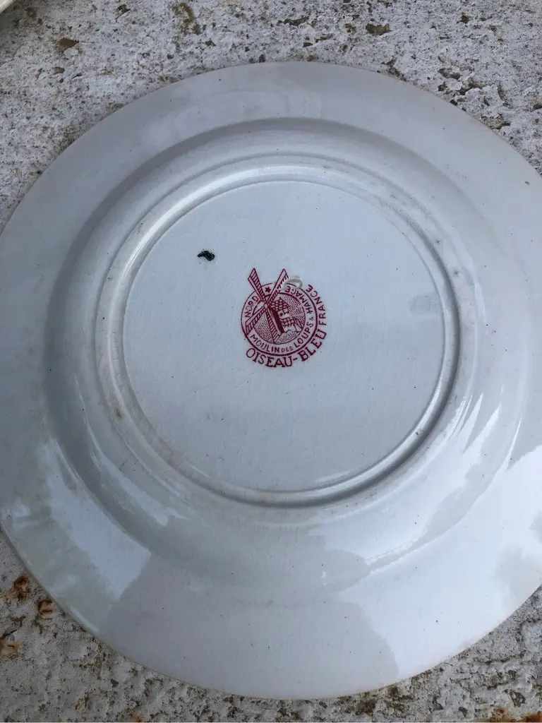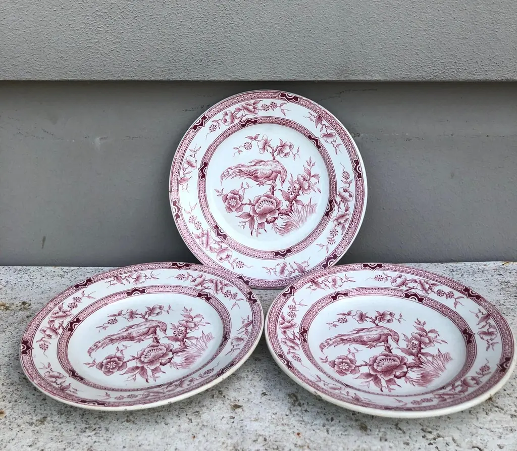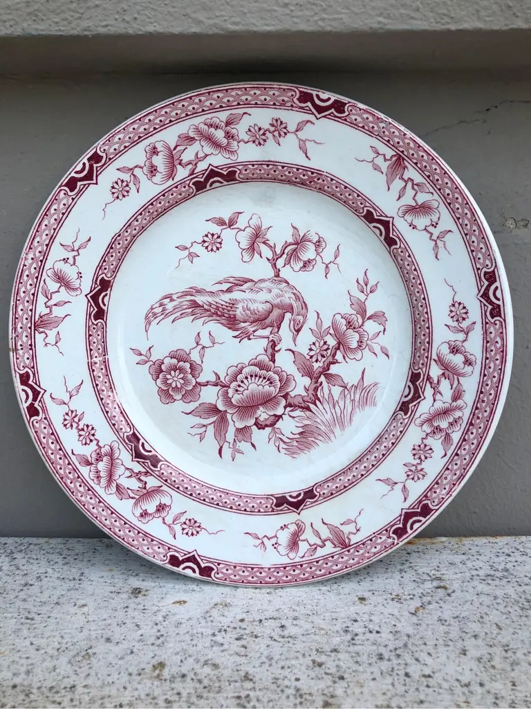 French Faience Pink Plate signed Moulin des Loups Hamage Orchies Circa 1900.Chinoiserie period.Bird and flowers.4 plates available.