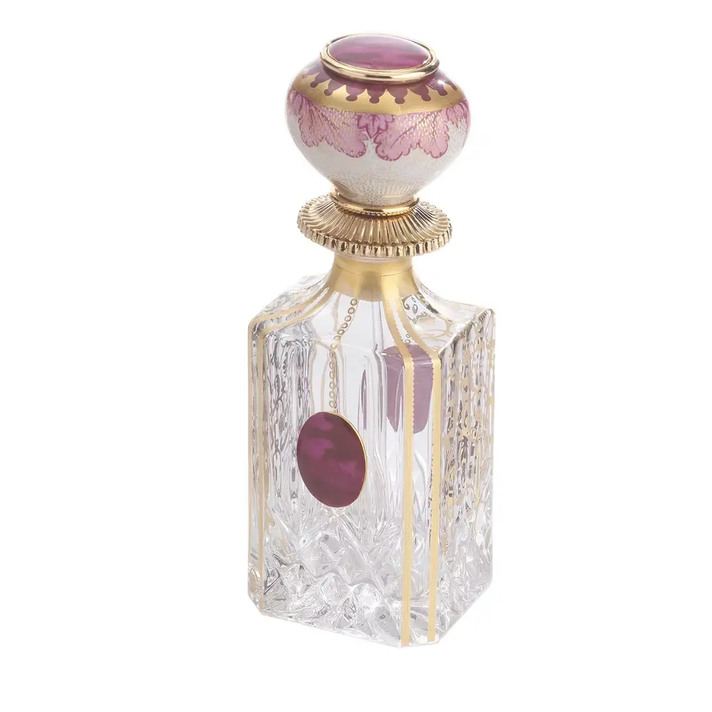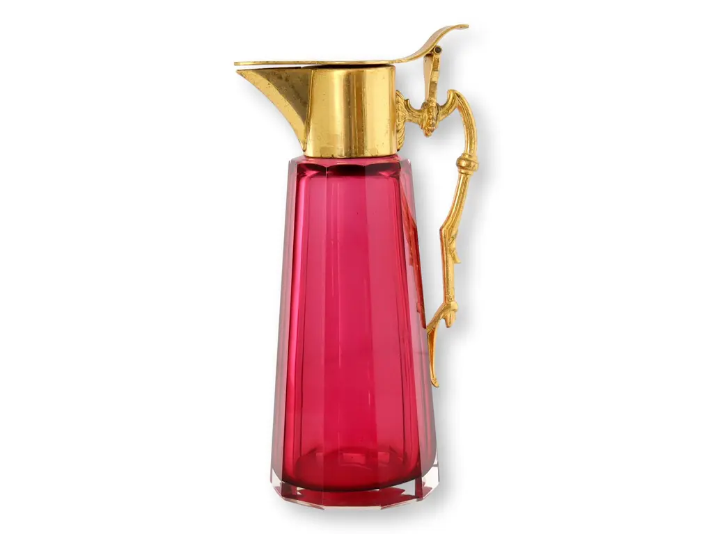 Elegant French Gilt & Cranberry Syrup Pitcher, petite in size. Features deep cranberry cut glass contrasted with bright gilded fittings. A stunning example of fine glasswork, perfect for adding a touch of French sophistication to any collection. Unsigned.