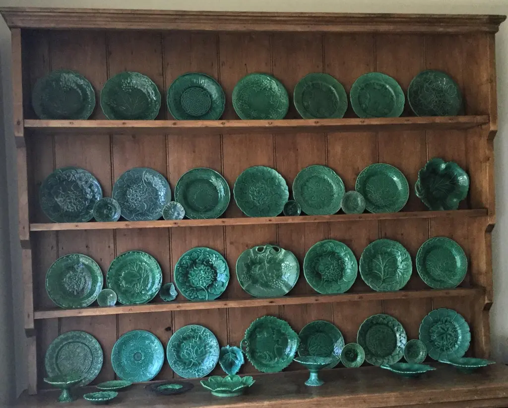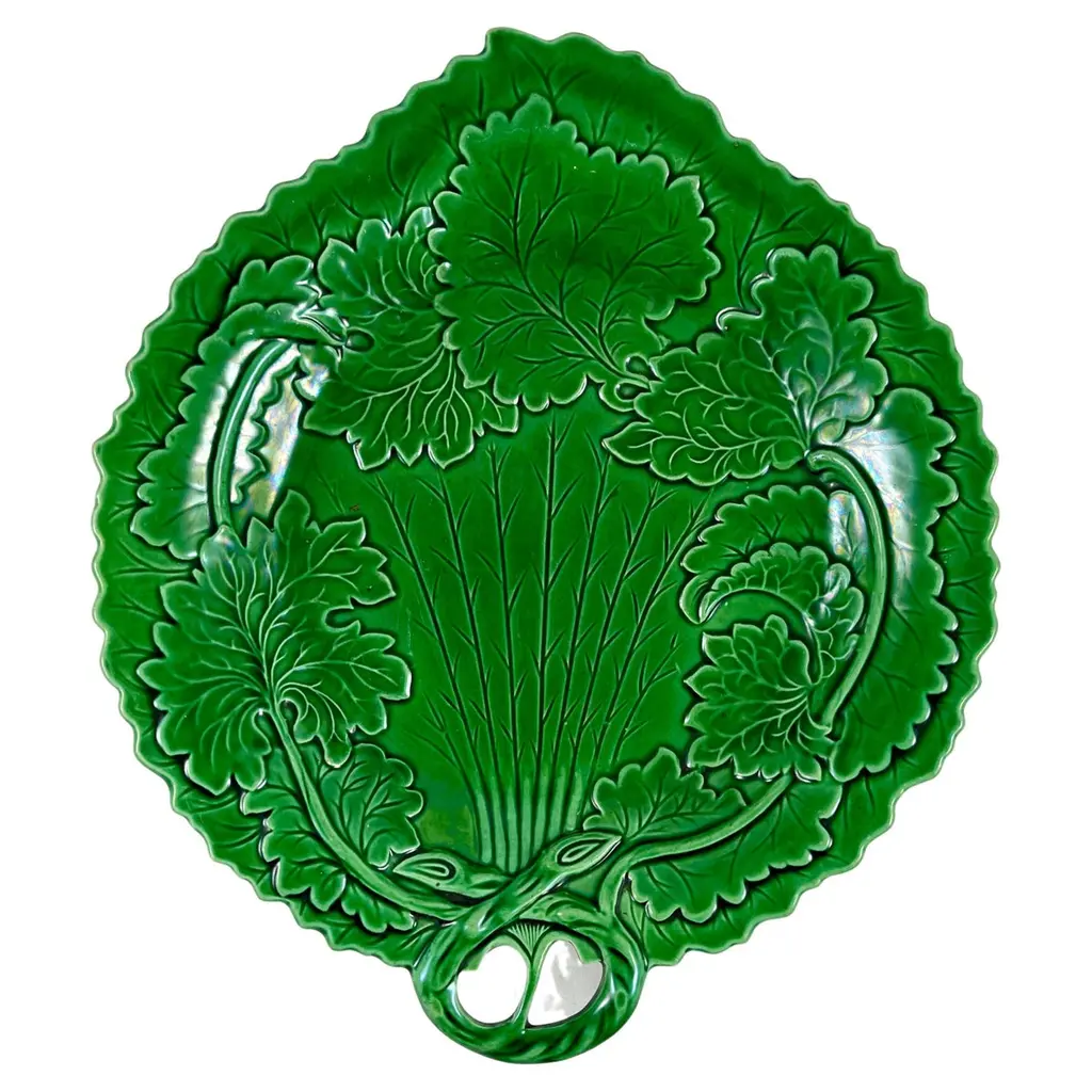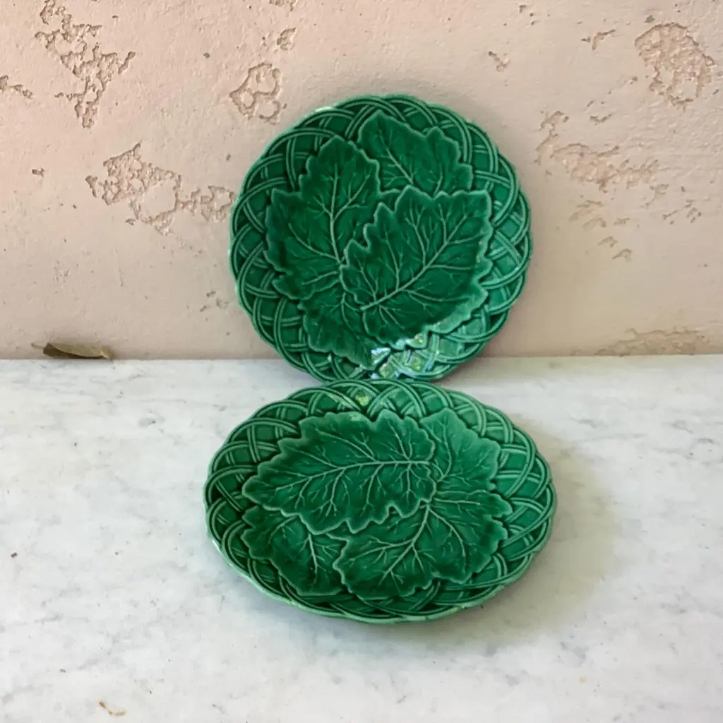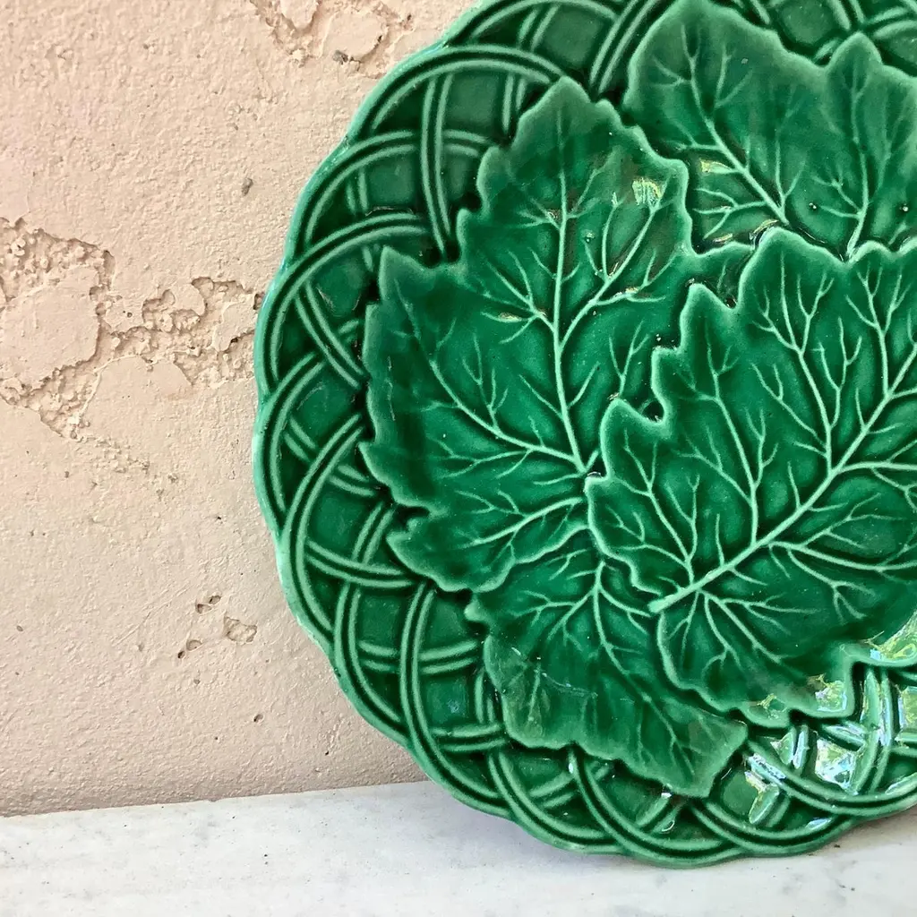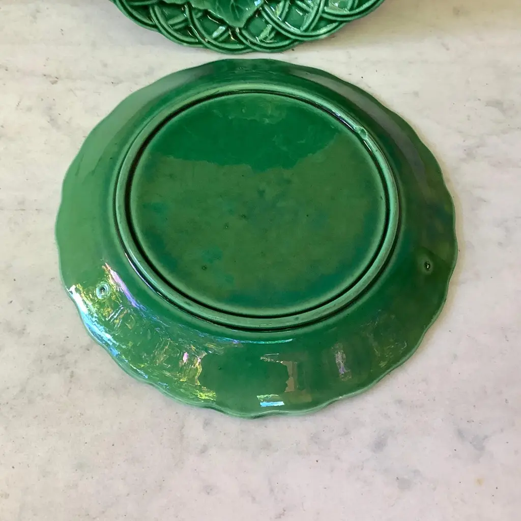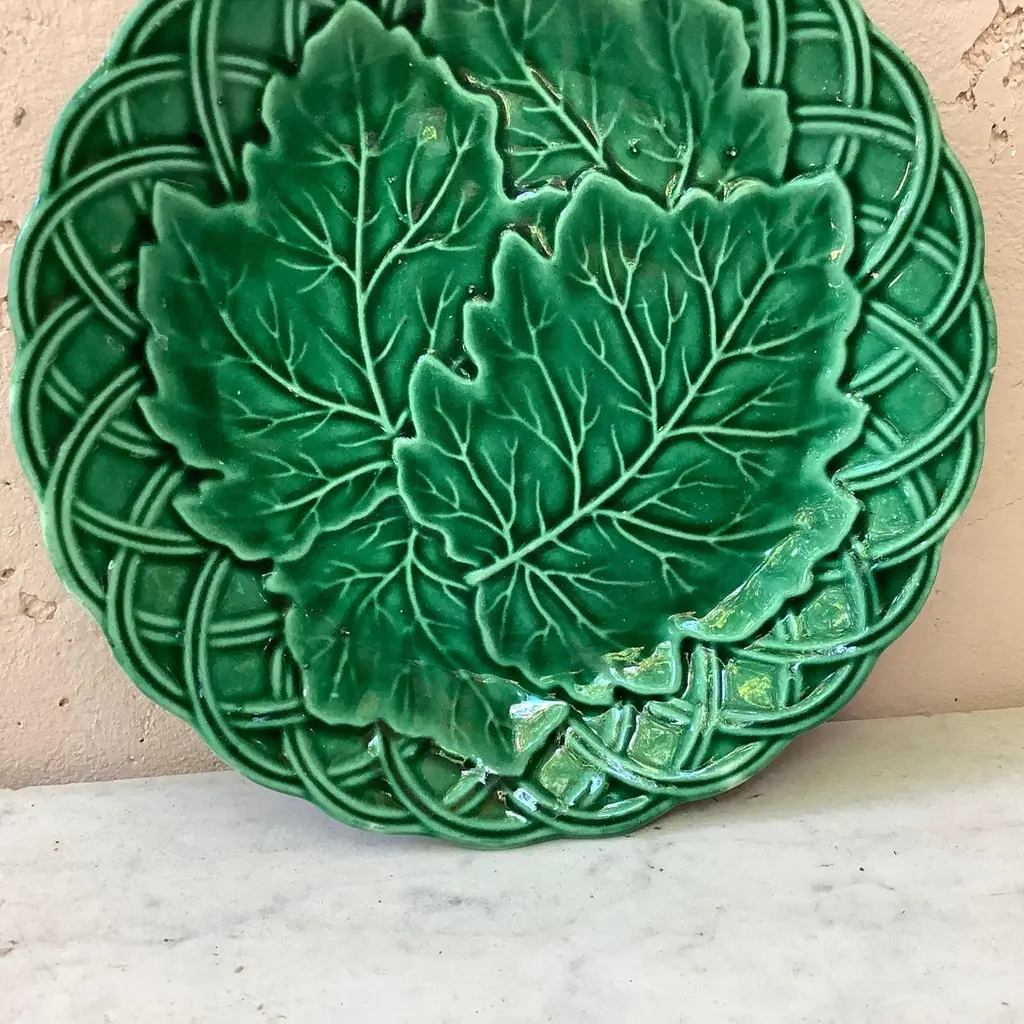 French green Majolica leaves on basket weave background plate, circa 1880.