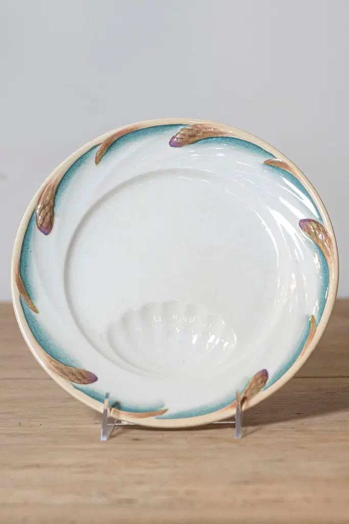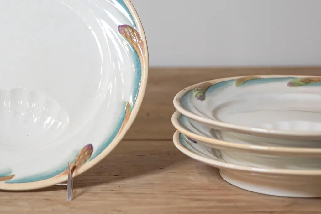 Four French Sarreguemines asparagus plates from the late 19th century, with teal accents and shell-shaped hole for the sauce. We currently have four plates left, priced and sold individually. Born in France during the later years of the 19th century, each of these four delicate Sarreguemines asparagus plates features a delicate border adorned with teal accents and asparagus head motifs, surrounding the center showcasing a shell-shaped hole ideal for the mousseline, Hollandaise or any sauce of your liking! Marked Sarreguemines with U & C overlay in the back, these French asparagus plates from the late 19th century will bring a touch of finesse to any home.