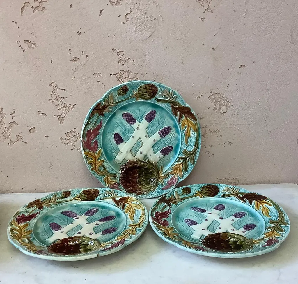 French Majolica asparagus plate Orchies, circa 1890.8 plates are available.