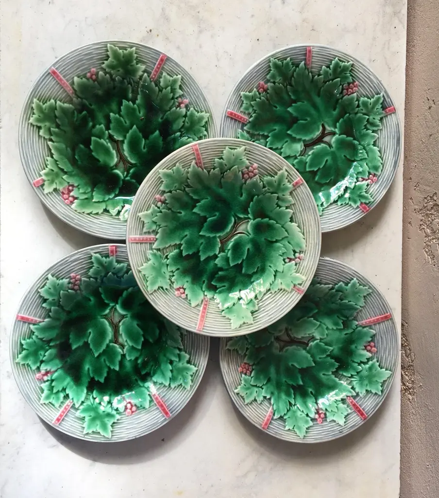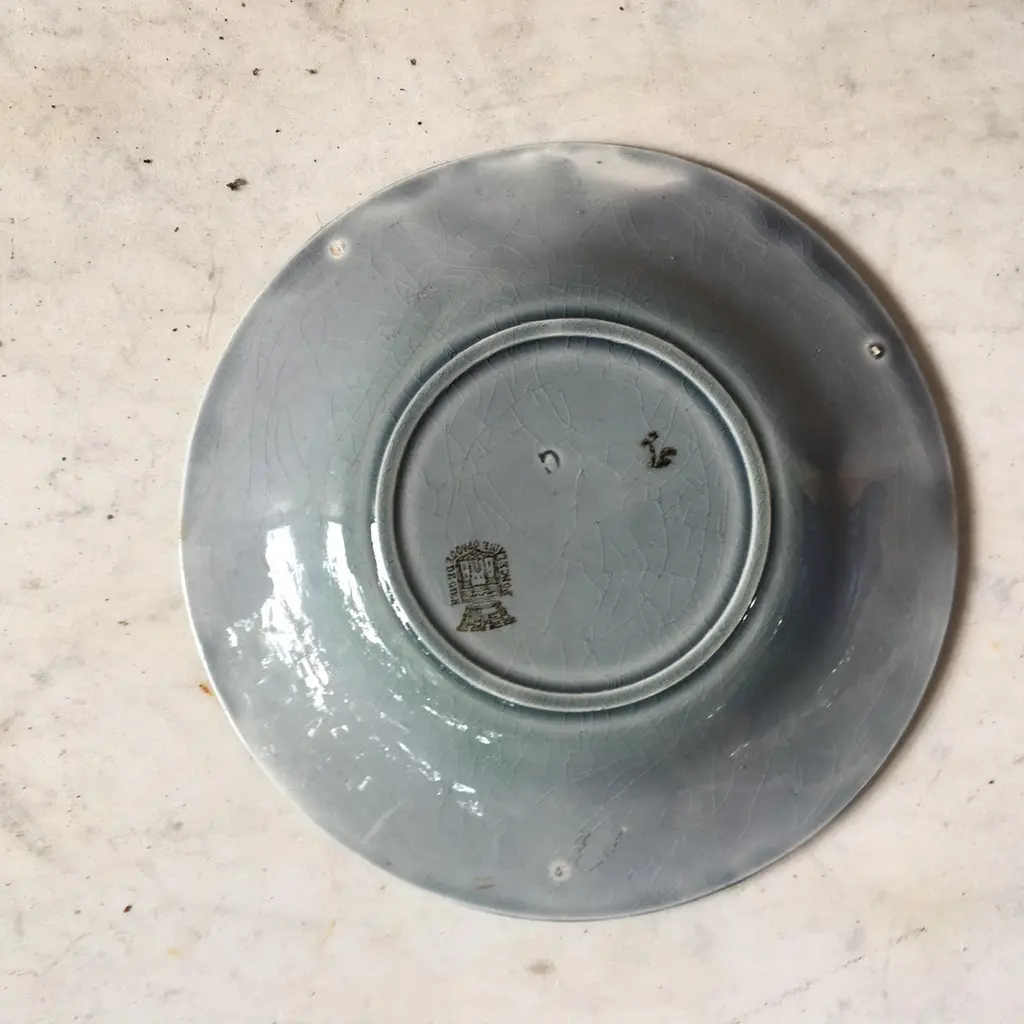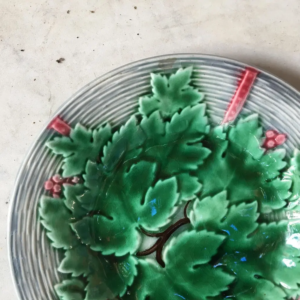 Charming French Majolica plate with grapes and leaves on a grey basket weave background signed Gien, circa 1890.