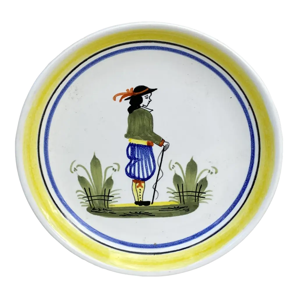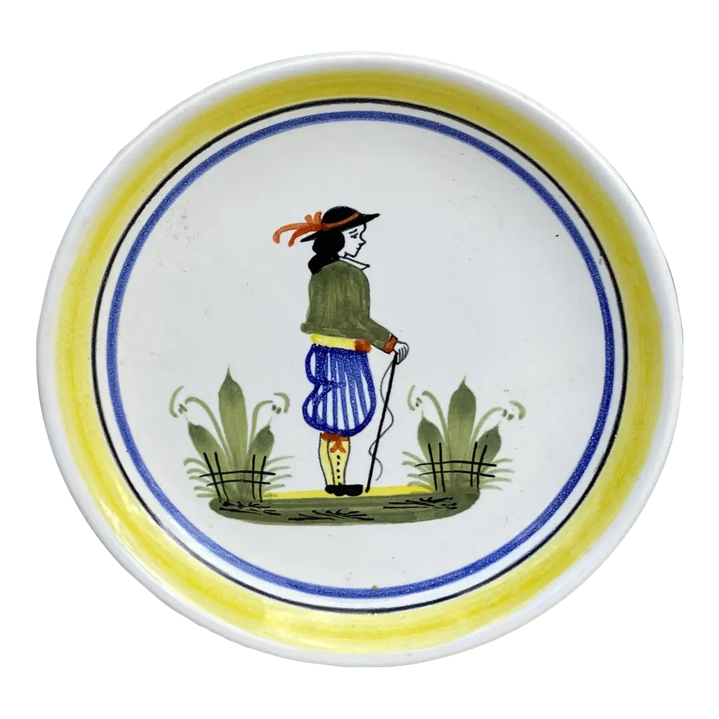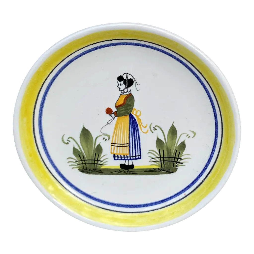 French Miniature Henriot Quimper Plate signed circa 1950.A bretonne woman is represented on the center with a yellow border.