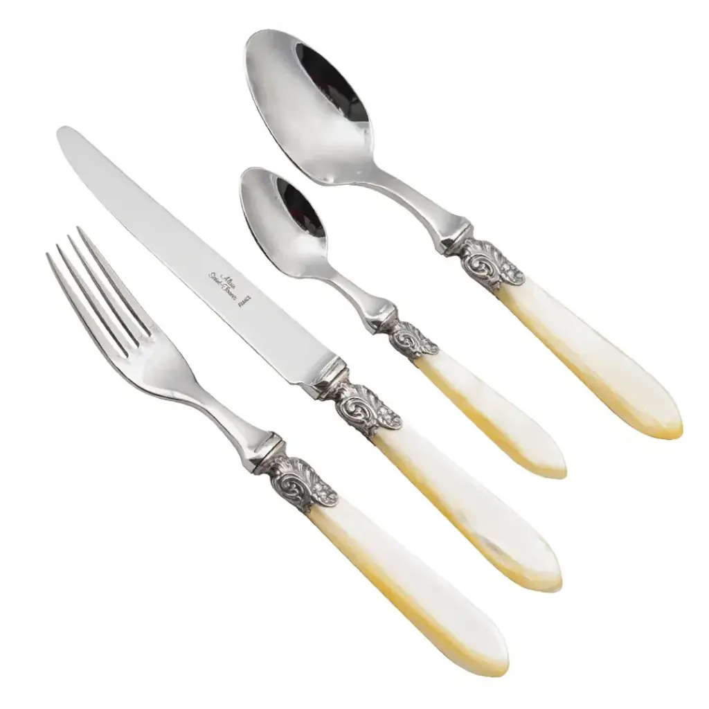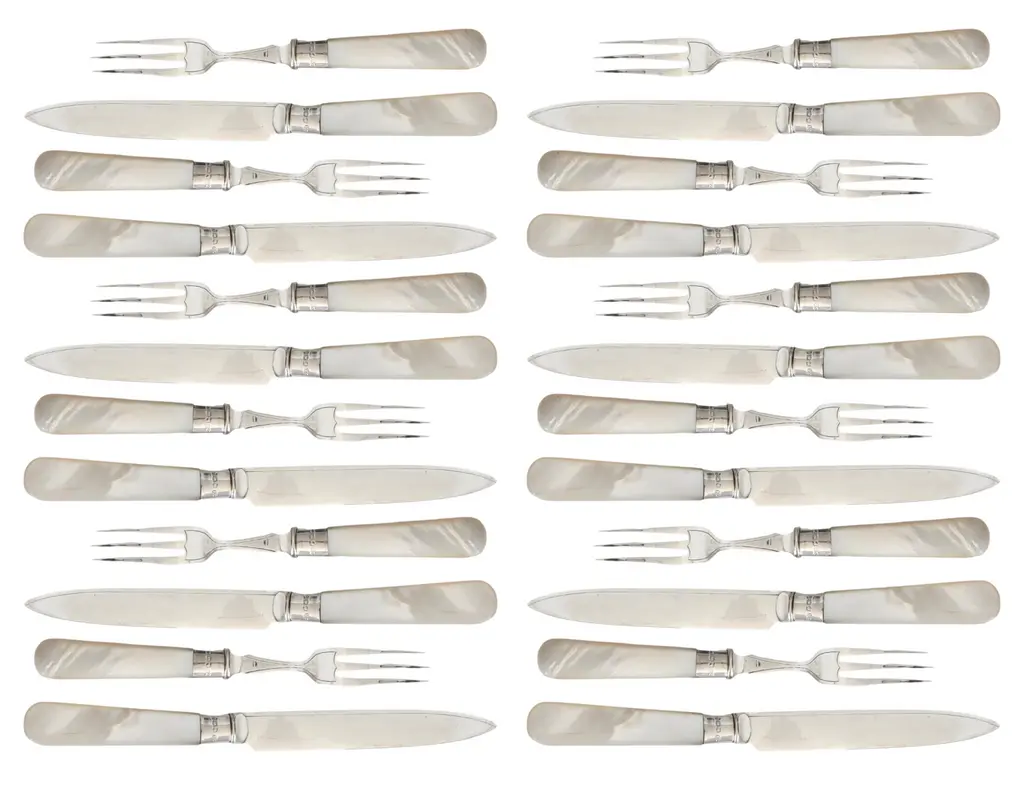 This exquisite 20-piece antique French flatware set features mother-of-pearl handles and bronze blades, epitomizing the elegance of La Belle ��poque styling. Each piece is meticulously crafted, showcasing the timeless beauty and sophistication of the period. Designed for dessert and pastry service, this set adds a touch of refined charm to any table setting. Dimensions: knife, 6.5"L x .5"W x .25"H; fork, 6"L x .5"W x .25"H. No maker's mark.