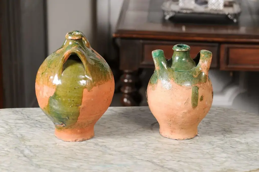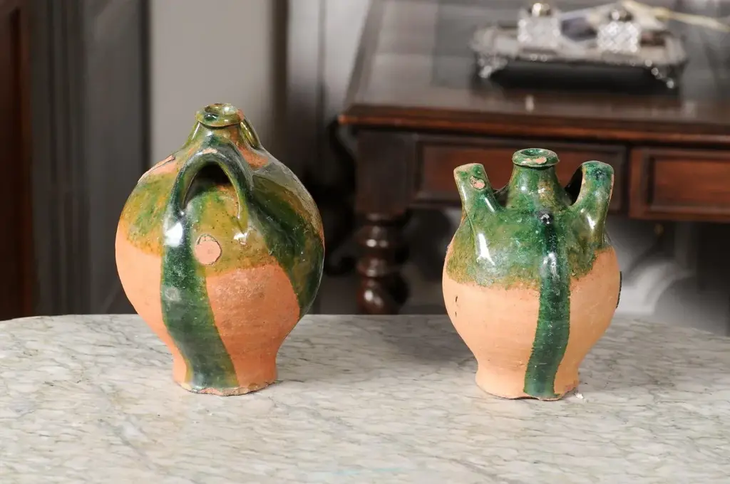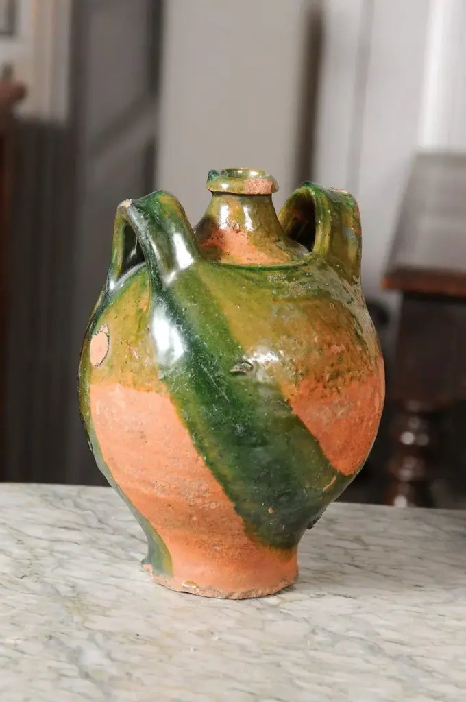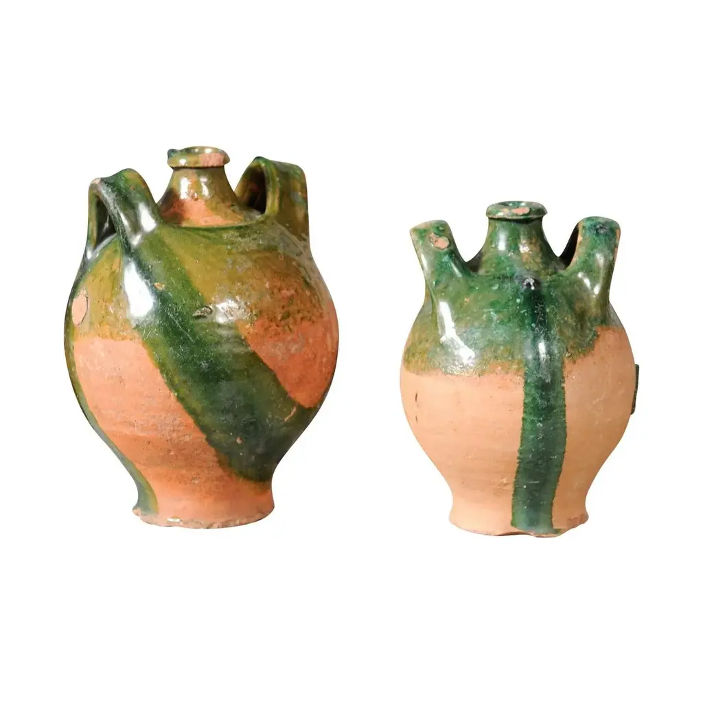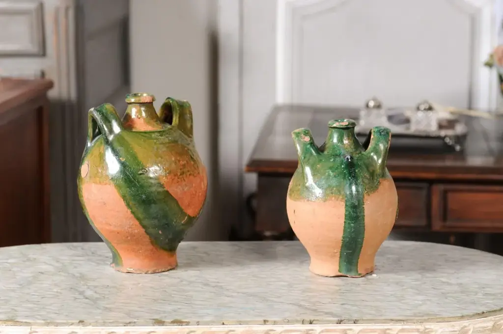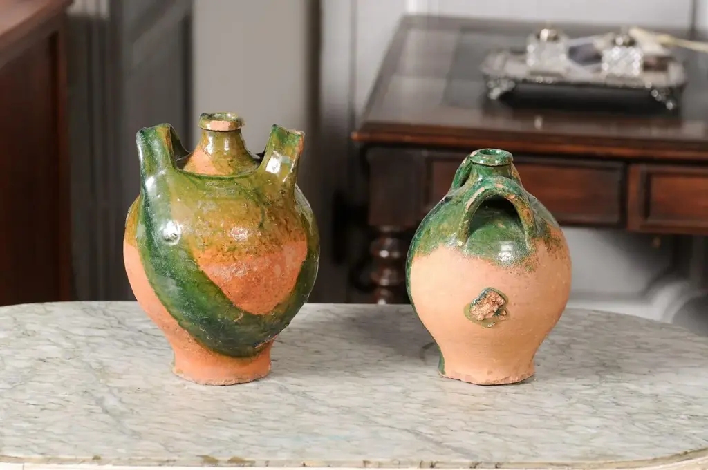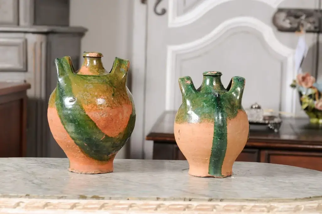 Two French Provincial Napoléon III period pottery jugs from circa 1850 with green glaze, dripping and lateral handles flanking the central spout. They are priced and sold individually. A pair of French Provincial Napoléon III period pottery jugs from circa 1850, boasting a rustic green glaze with an enchanting drip effect, and featuring dual lateral handles embracing a central spout. Crafted in the French countryside during the Napoléon III era around 1850, these charming pottery jugs emanate a warm, rustic allure. The jugs present an arresting green glaze that artistically drips down their voluptuous bodies, conjuring images of vine-laden countrysides and pastoral simplicity. Each jug is adorned with two sturdy lateral handles that gracefully flank a prominent central spout, a design that marries functionality with a timeless aesthetic. The jugs’ rounded bodies gradually taper towards the base, while the necks subtly narrow before flaring out to form the spout, a design choice that both complements and contrasts the robust forms. The intriguing drip effect of the glaze enhances the jugs’ rustic character, while the rich green color present in the upper section beautifully reflects the verdant landscapes of the French provinces. In good condition considering their age, these jugs capture the essence of a bygone era, their imperfections and patina adding to their authentic charm. Ideal for both decorative and utilitarian purposes, these jugs would serve as stunning statement pieces in a kitchen, dining room, or any space seeking to imbibe the warmth of French country living. Sold individually, each of these French Provincial Napoléon III period pottery jugs with green glaze and rustic appeal will undoubtedly become a treasured addition to any home or collection.