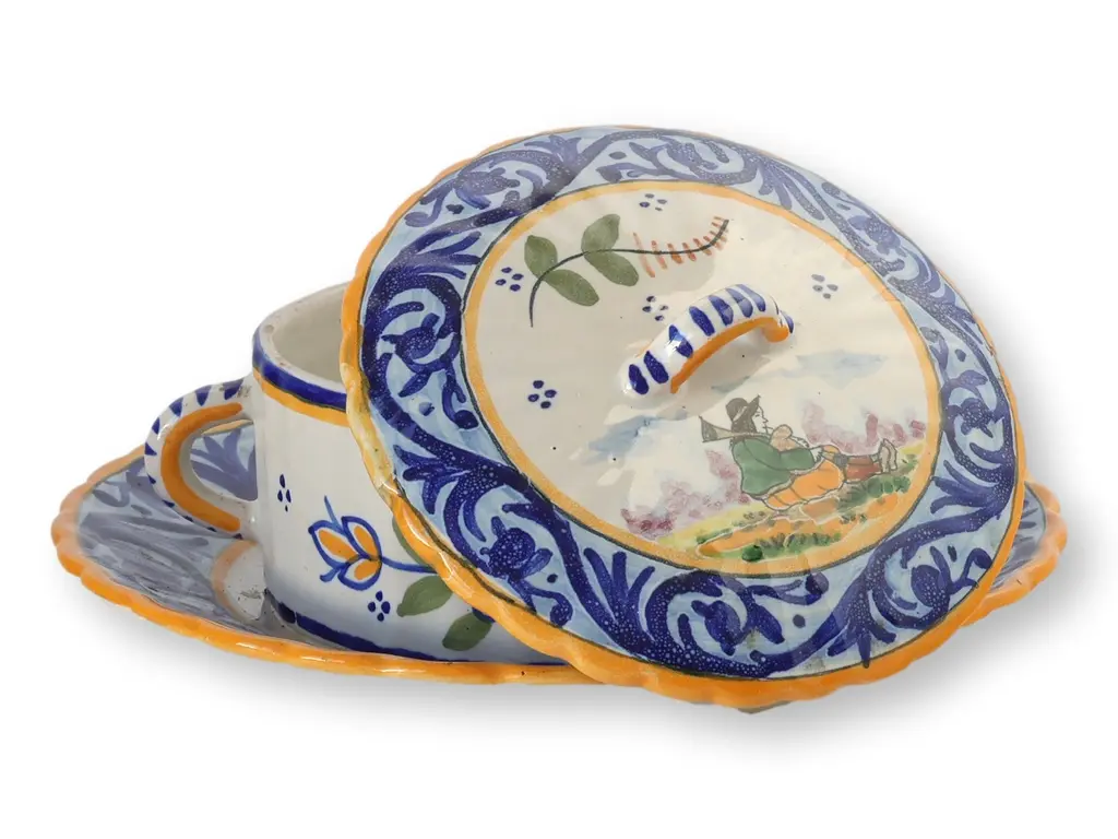This charming Quimper faience butter dish from the early 20th century features vibrant hand-painted floral motifs in classic blues, yellows, and greens. The lidded dish with double handles and attached underplate reflects the traditional craftsmanship and rustic elegance of Quimper pottery. Perfect for adding a touch of French country charm to your table or collection, this piece beautifully showcases the artistry of this renowned faience tradition. Signed on underside.