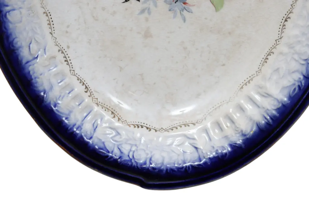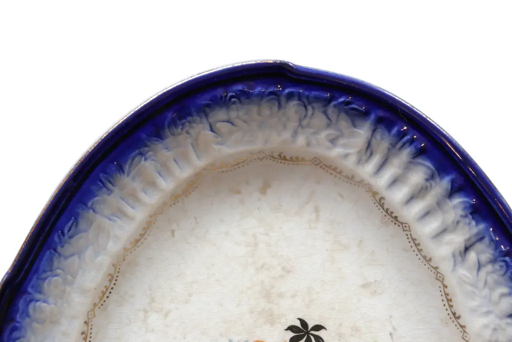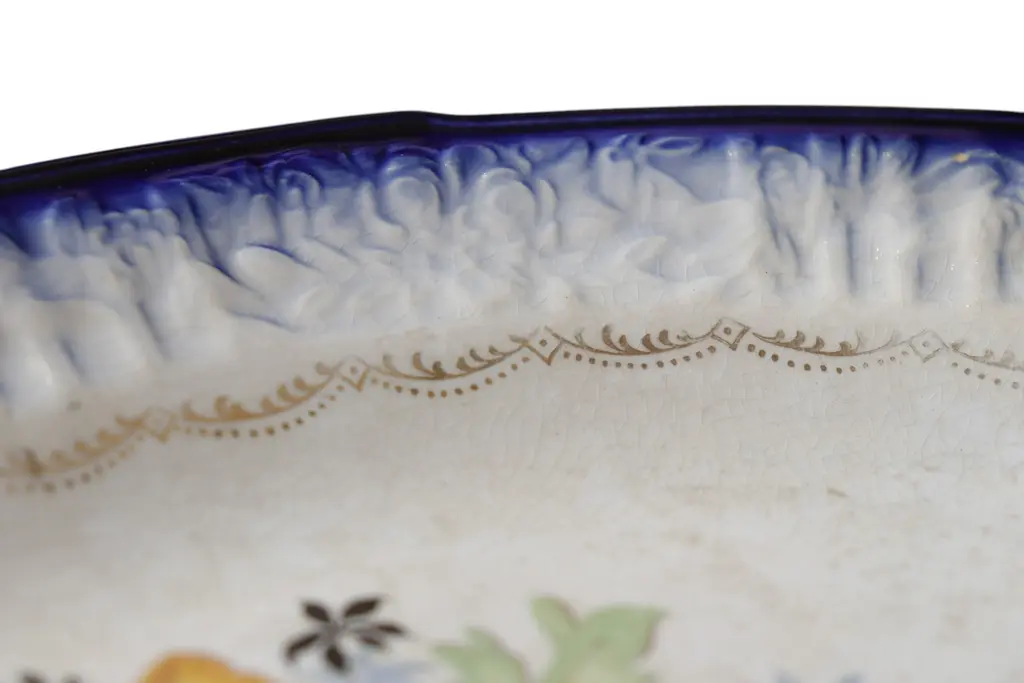 A mid-century French Saxon China Co. small ceramic platter. Decorated with a cobalt blue floral embossed lip, central floral spray and delicate 22K gold swags. Maker's mark underneath.