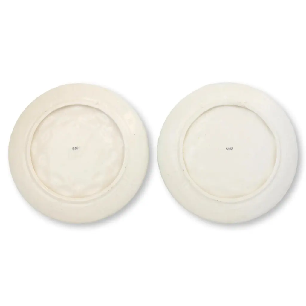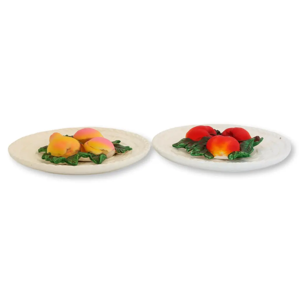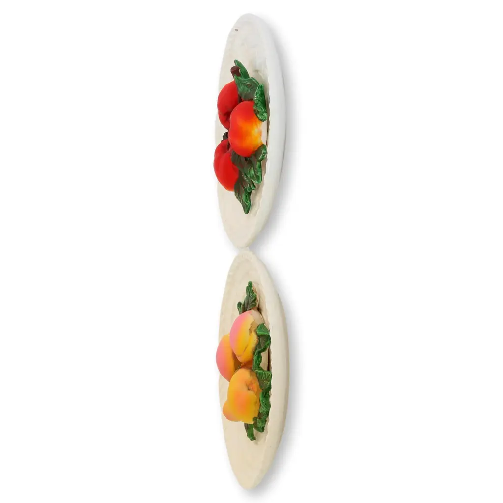 Pair of decorative apple and pear trompe l'oeil wall plates. Literally meaning 'trick of the eye', Trompe l'oeil is the technique of using realistic imagery to create an optical illusion of depth. Numbered on underside.