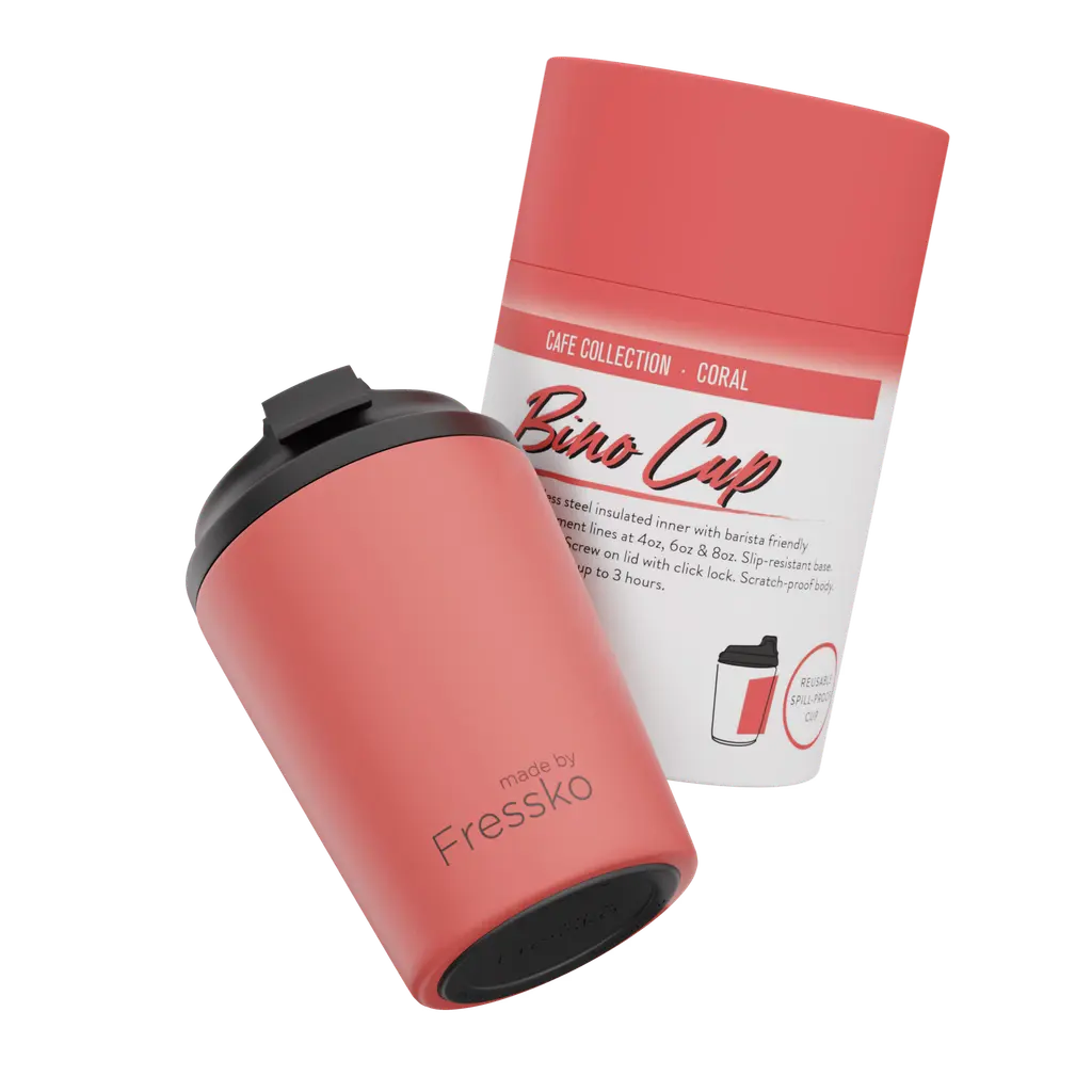 For that classic cup feel. Fressko's award-winning, world-renowned coffee cup, is now available with premium ceramic interior coating for a lustrous look and feel. Say no to excessive waste and yes to sipping more sustainably today, tomorrow and forever.Features: Shatterproof ceramic lining.Colour-matched inner.Stays hot for up to 3 hours, depending on use.Insulated for cold drinks as well.Easy to clean with a no-fuss, click-back lid.Features internal Barista lines.Fits under standard coffee machines.Fits in a standard car cup holder.Ideal for travel.Allows for safe sipping of hot beverages around young children.The outer surface stays cool to the touch.Compatible with a Fressko Leather Sleeve for extra comfort.Designed in Melbourne, Australia.Responsibly made in China.