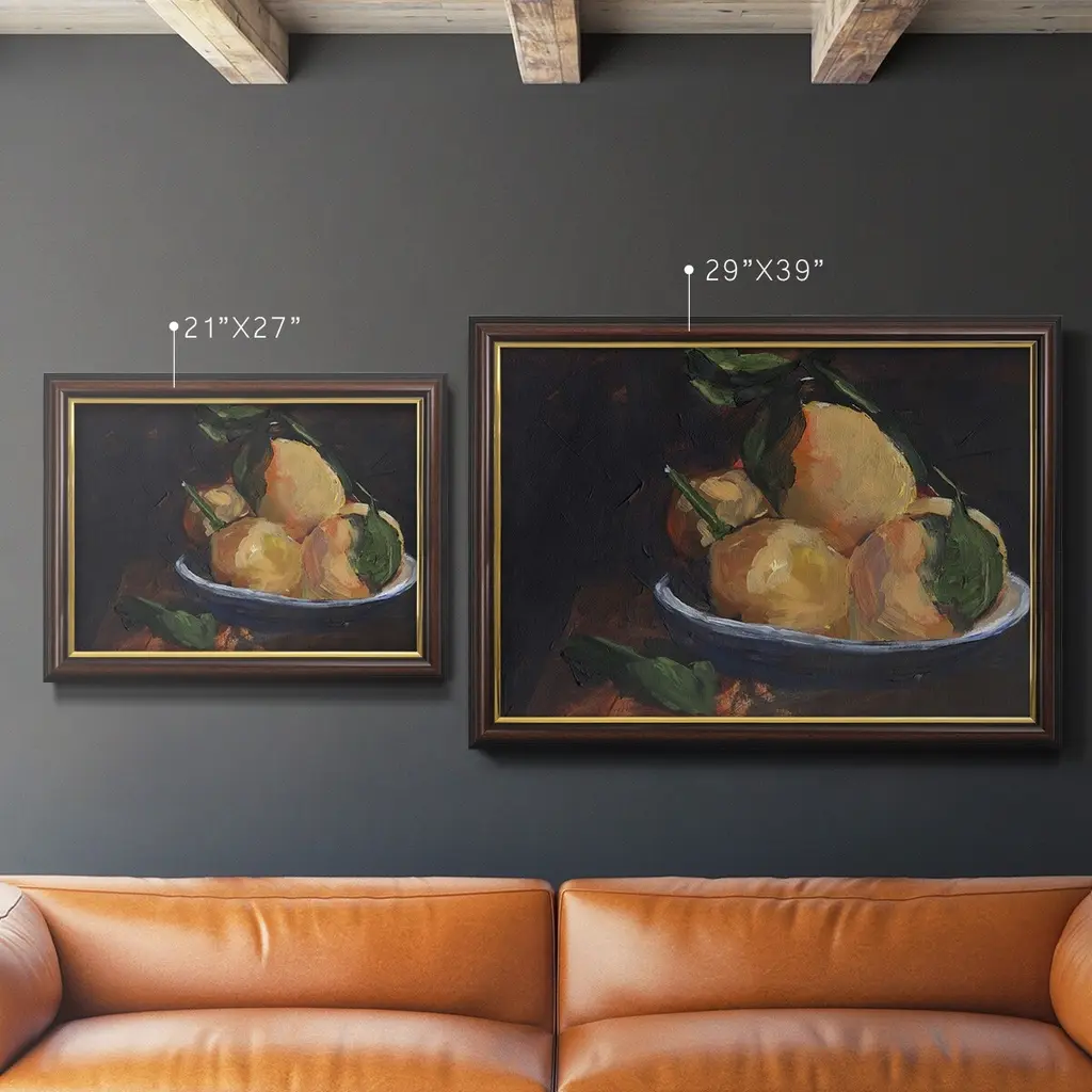 Fruit Plate I Premium Framed Canvas- Ready to Hang A Premium Framed Canvas created to last. Framed in distressed wood and available in an array of sizes and colors Featuring a beveled a solid wood stretcher bar, each piece comes ready to hand 3 SIZES AVAILABLE 16''X20'' - Overall Size 18'X27'' - Overall Size 24''x36'' - Overall Size Each piece is made to order. Each piece comes with hanging hardware. Made in the USA Ready to Hang Giclee Paper Print Acrylic Glass Beveled Matt Board