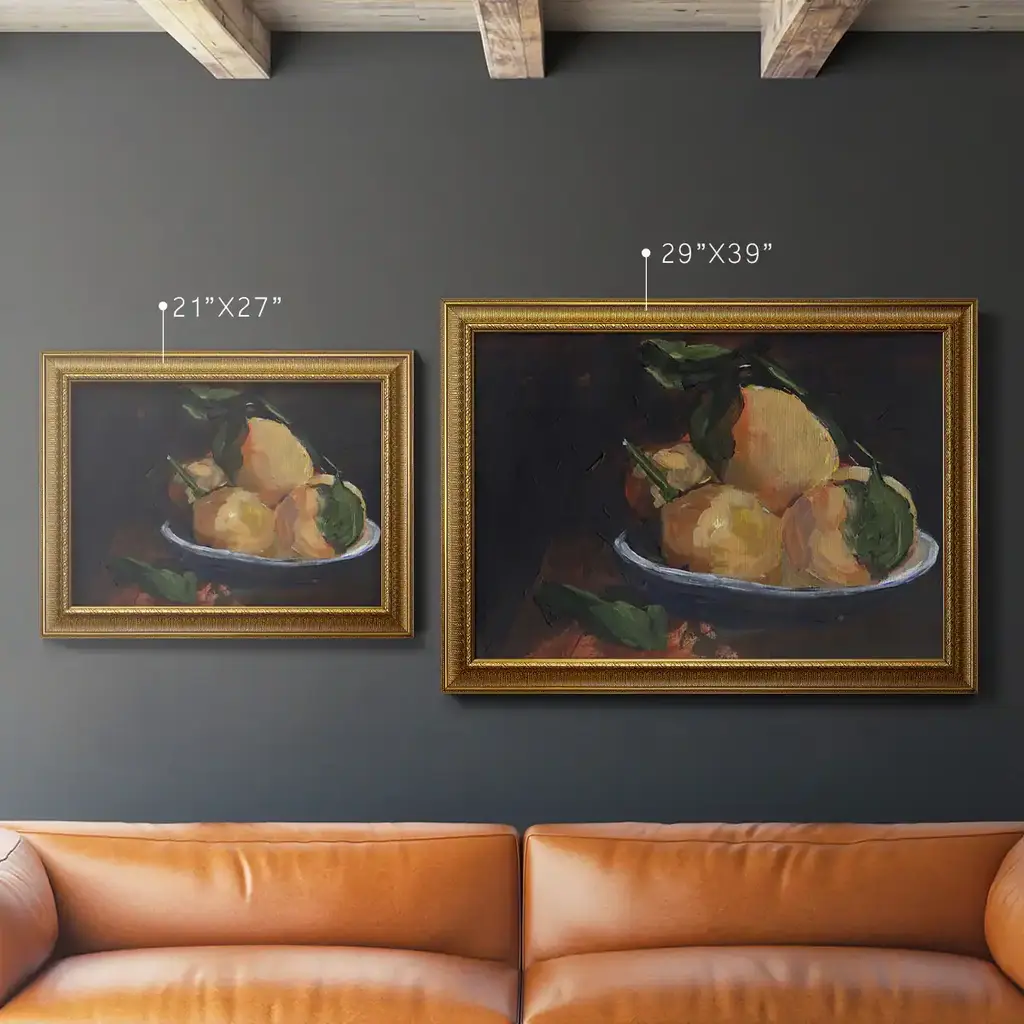 Fruit Plate I Premium Framed Canvas- Ready to Hang A Premium Framed Canvas created to last. Framed in distressed wood and available in an array of sizes and colors Featuring a beveled a solid wood stretcher bar, each piece comes ready to hand 3 SIZES AVAILABLE 16''X20'' - Overall Size 18'X27'' - Overall Size 24''x36'' - Overall Size Each piece is made to order. Each piece comes with hanging hardware. Made in the USA Ready to Hang Giclee Paper Print Acrylic Glass Beveled Matt Board