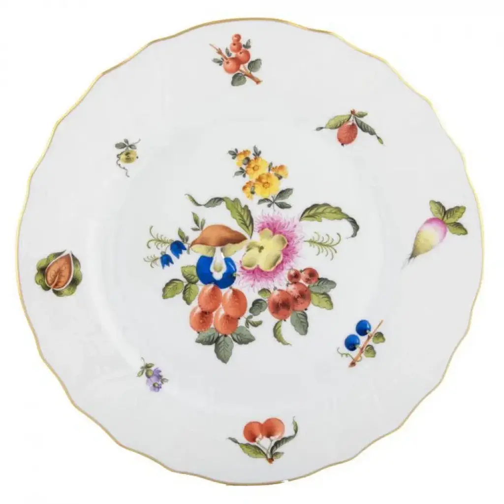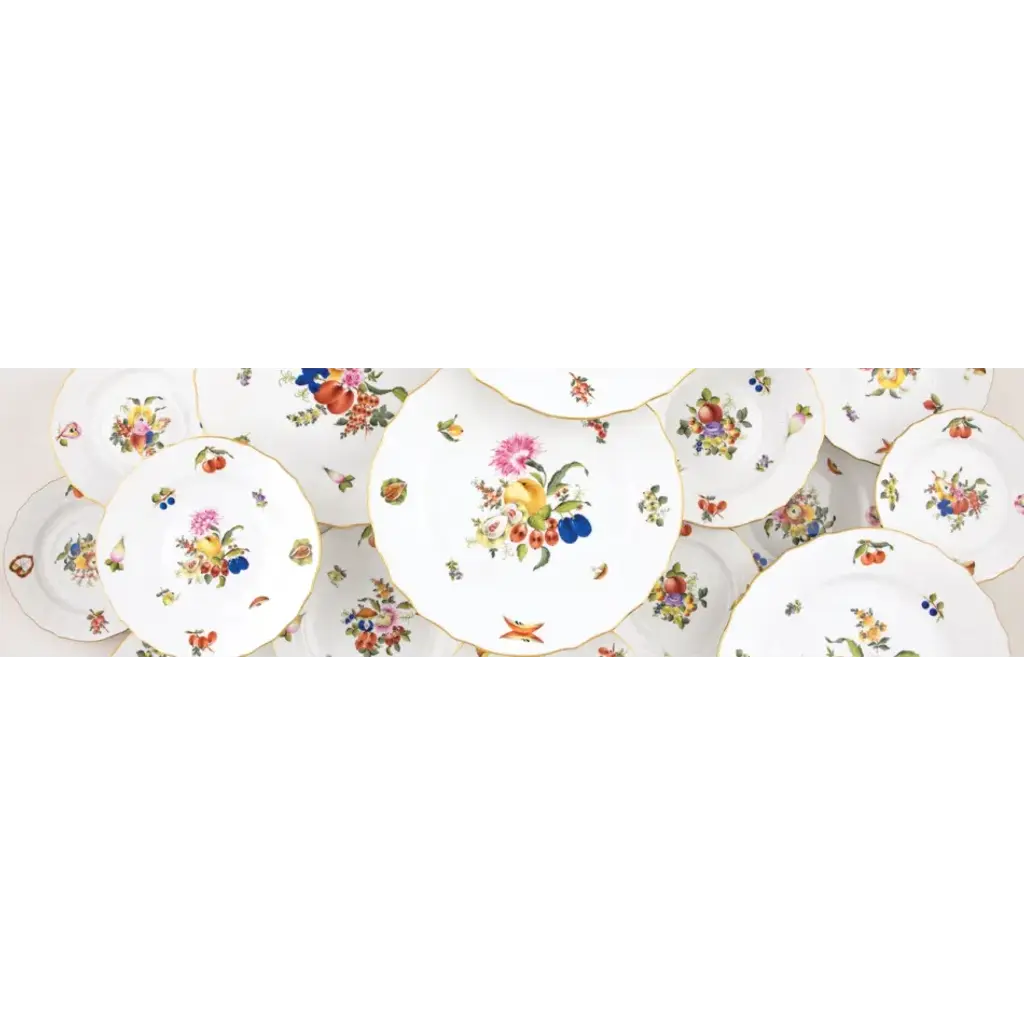 Since its introduction in the 1860s this pattern, with its beautiful compositions of fruits and flowers, has been favored by many royal houses. The Imperial Court of Russia ordered a set after its display at the World Exhibition of 1900. Now the biggest porcelain manufactory in Europe, Herend was founded in 1826 to produce earthenware in the small Hungarian village for which it was named. At the time, Hungary was flooded with low-cost pottery, but in 1839, Mor Fischer became the Manufactory’s new owner and he decided to focus on producing dinnerware replacement pieces for Europe’s royal families to complement their valuable porcelain patterns from Germany and the Far East. As his client base grew, Fischer commissioned his artists to begin designing dinnerware patterns of their own. Queen Victoria’s 1851 purchase of a large set for Windsor Castle was a milestone, setting the stage for aristocrats throughout Europe to clamor for Herend in their estates. In the 1850s, Herend added meticulously-crafted figurines to its creations. Herend’s trademark fishnet pattern, which is widely recognized and prized as Herend’s signature design, started in 1858 when an artist who was intrigued with a Chinese plate’s fish scale design painted it onto a rooster figurine to imitate feathers.