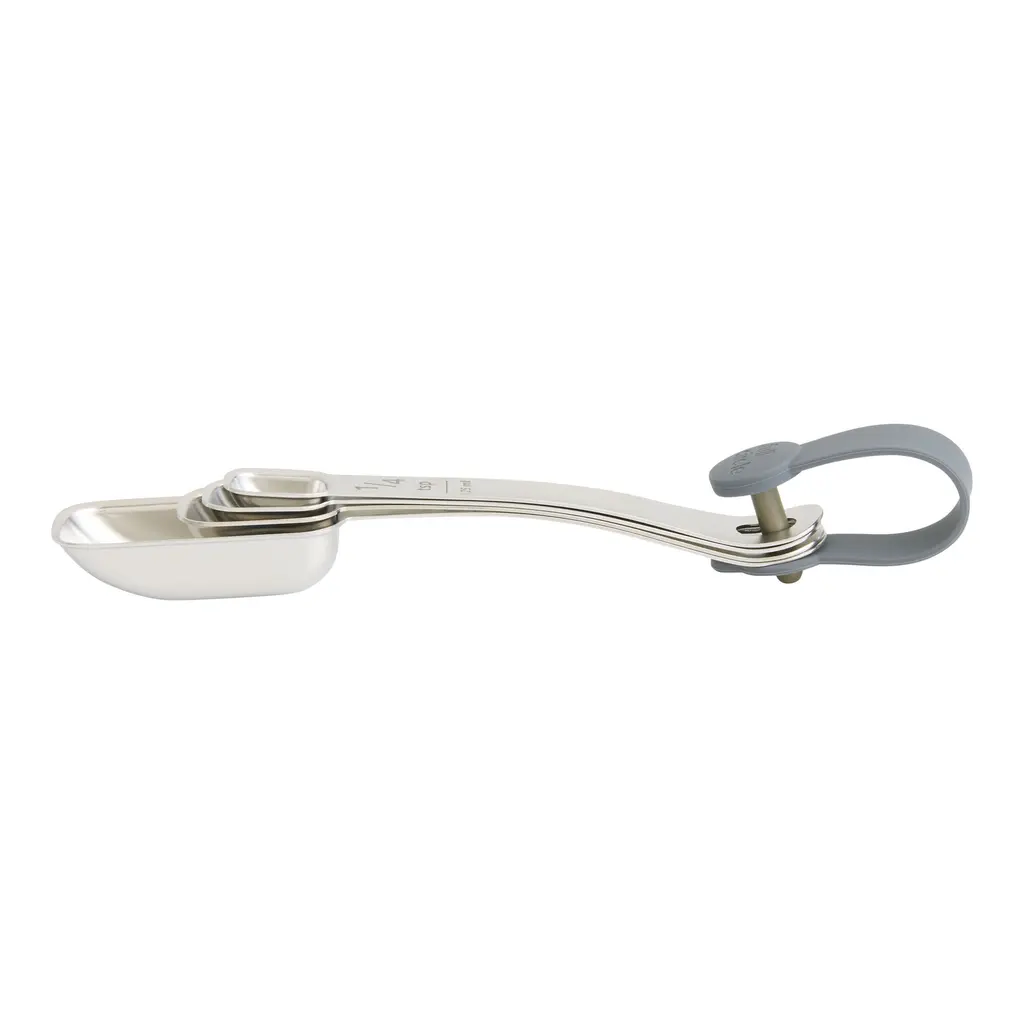 Full Circle's nesting measuring spoons are ready to go "skinny dipping" to the bottom of jars to get the last bits of baking and cooking ingredients. A scoop-style set of four accurate measurements, they're smartly shaped to fit into narrow openings and scrape along the sides and corners of containers. Compact for easy storage with a flexible silicone tether, these accurate measuring tools are made of dishwasher-safe stainless steel.