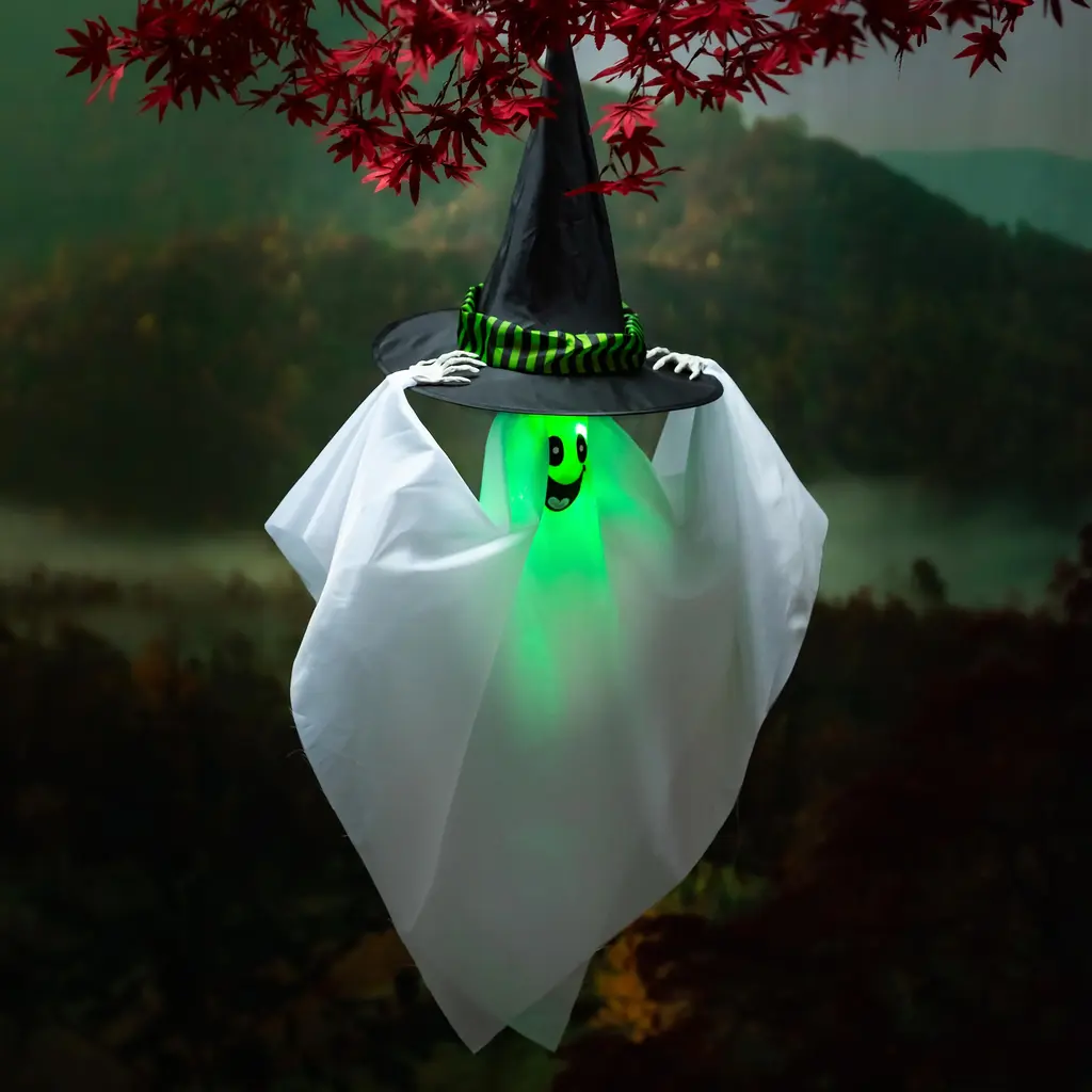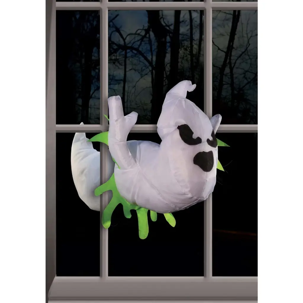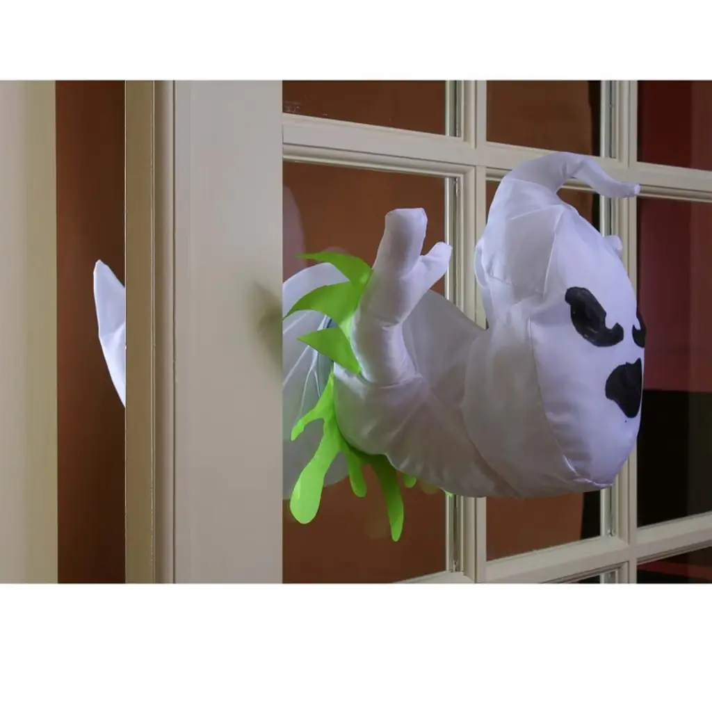 This 2-piece window decoration set includes 20-inch ghost props with suction cups. Designed for indoor or outdoor use on glass surfaces.