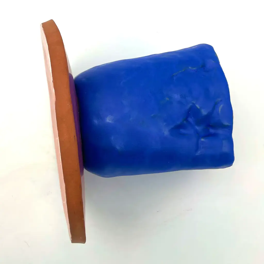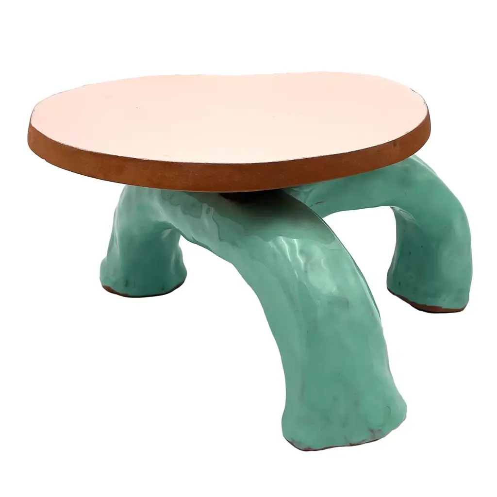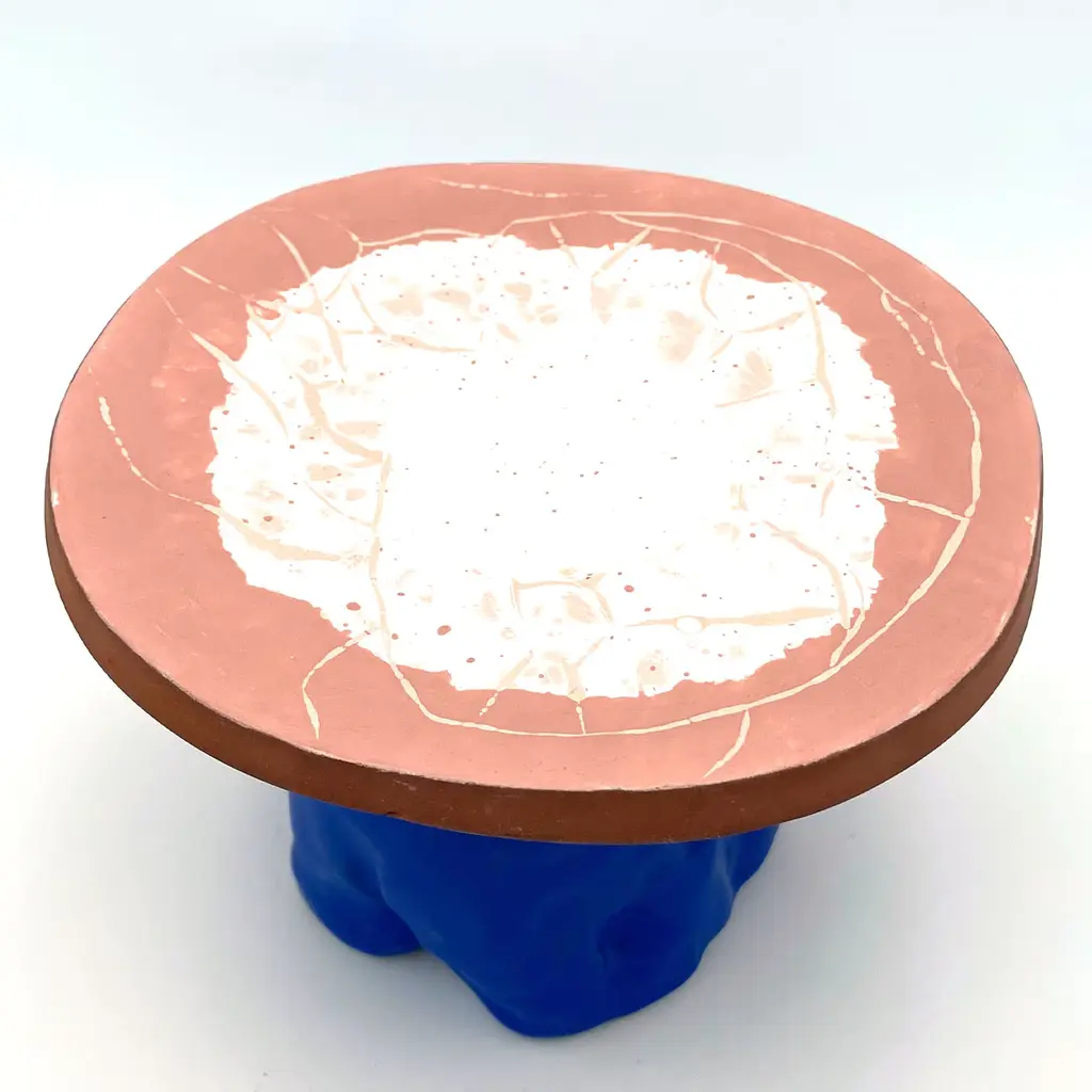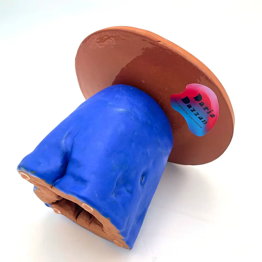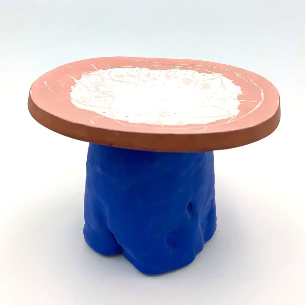 Fungo is a collection of cake stands created by Daria Dazzan. This piece is handmade and a one-of-a-kind, it is part of a limited series of 20 pieces. The element connecting all Fungo series is a solid disc of intense red clay, visible from its external edge. Stark, highly saturated, rich color combinations are the fine features of the pieces that Daria Dazzan creates at her multidiscipline atelier in Milano. All pieces may have natural, yet unique indistinct irregularities.