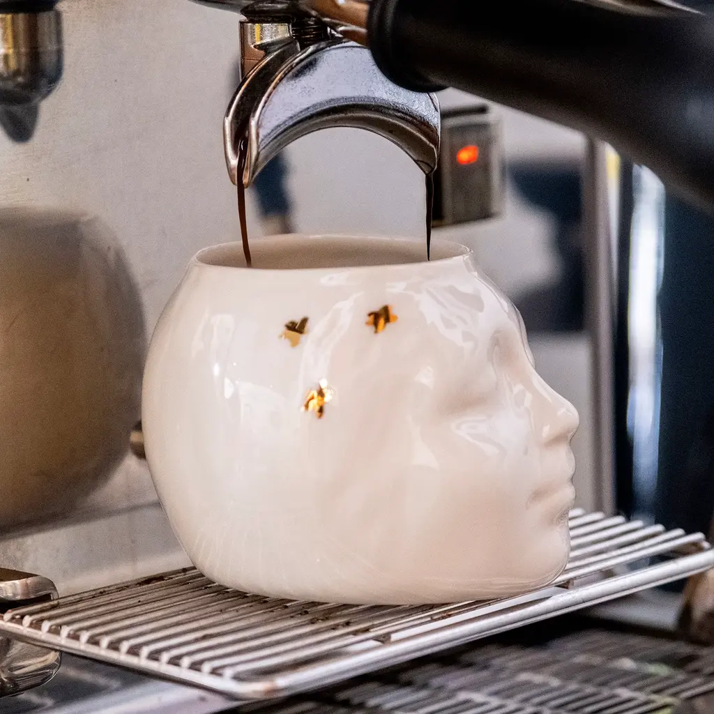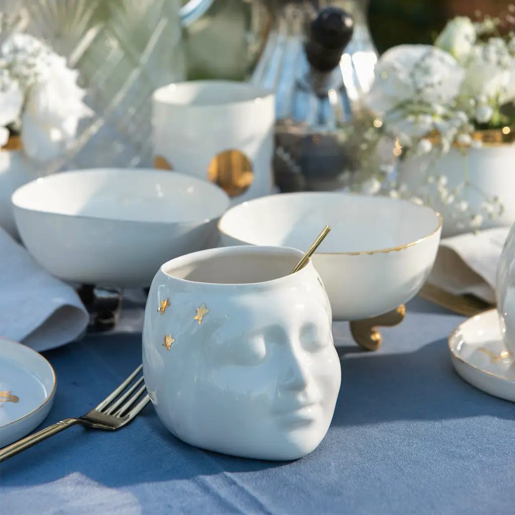 As an ode to Turkey's first female contemporary ceramist Füreya Koral, our Füreya Cup is handmade from fine Limoges porcelain. Featuring golden stars hand-gilded with 24-karat gold detailing on the hair, this unique piece combines functionality and aesthetics, adding elegance to your living spaces. It can alternatively be used as a distinctive ornamental object.