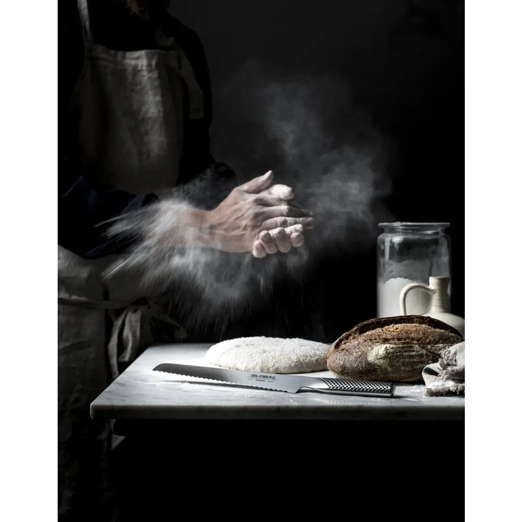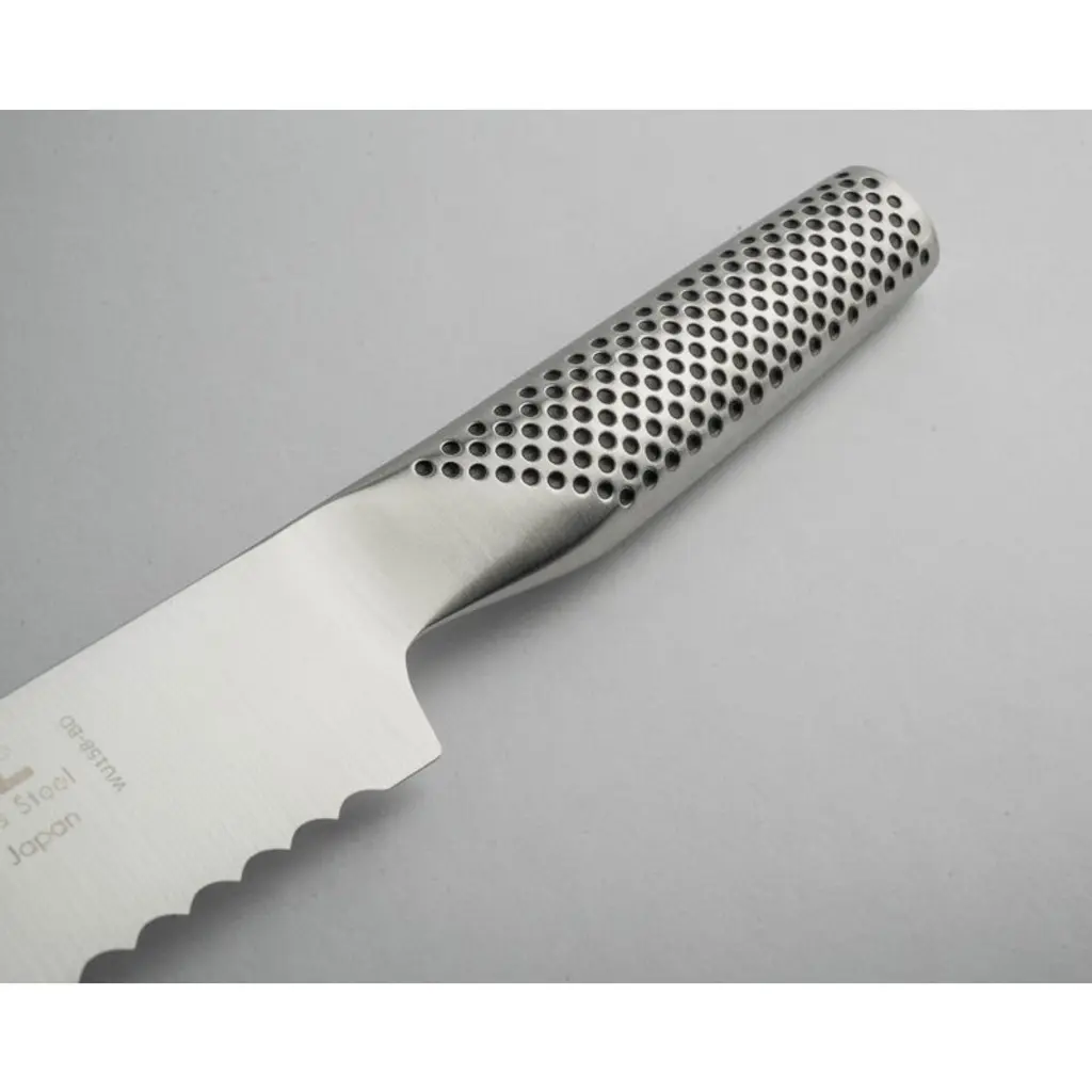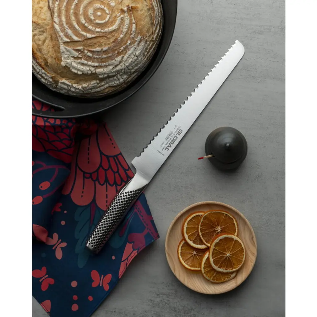The Global G-9 bread knife is specially designed for slicing bread and other crusty foods. The front side of the blade features a concave serration, while the back side is flat – a structure that helps guide the cut and ensures evenly thick slices. Crafted from all-stainless steel, the knife features a one-piece seamless construction that makes it exceptionally hygienic and easy to clean. The signature dotted handle is filled with sand to ensure a perfectly balanced grip. Designed by Komin Yamada, the knife performs brilliantly in both home kitchens and professional settings. Each Global knife is handcrafted in Japan, drawing on the tradition of samurai sword making. Forged from Cromova 18 – a high-grade, high-hardness stainless steel developed exclusively for Global – the blade offers excellent resistance to rust and corrosion. Thanks to its steep, acute cutting angle, the edge stays sharper for longer, delivering performance that surpasses conventional kitchen knives.