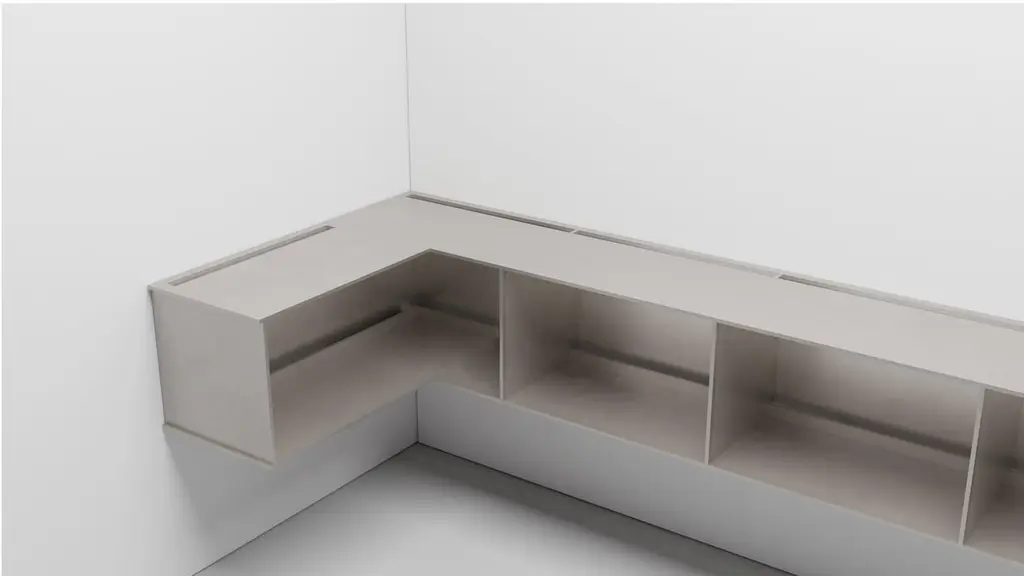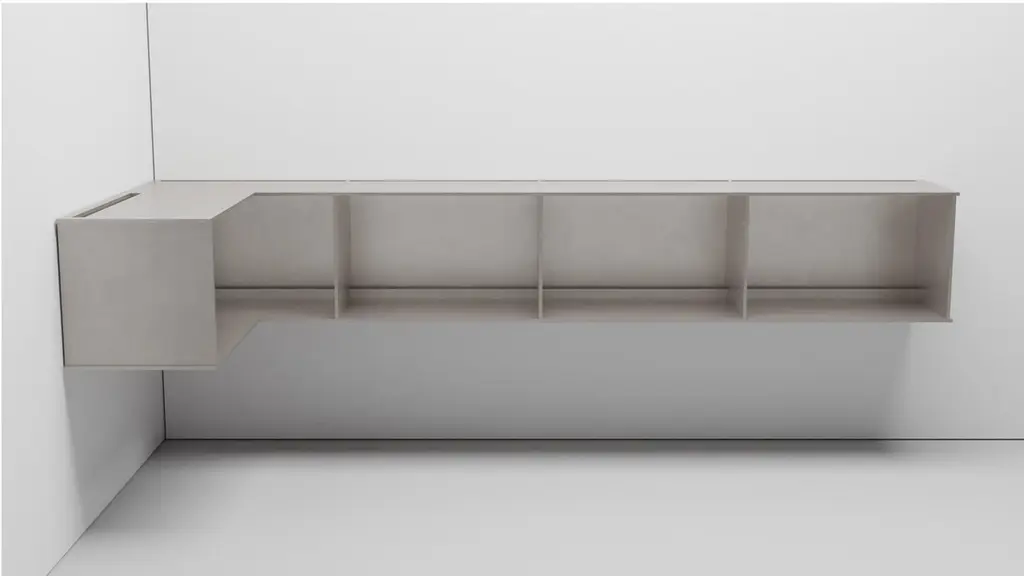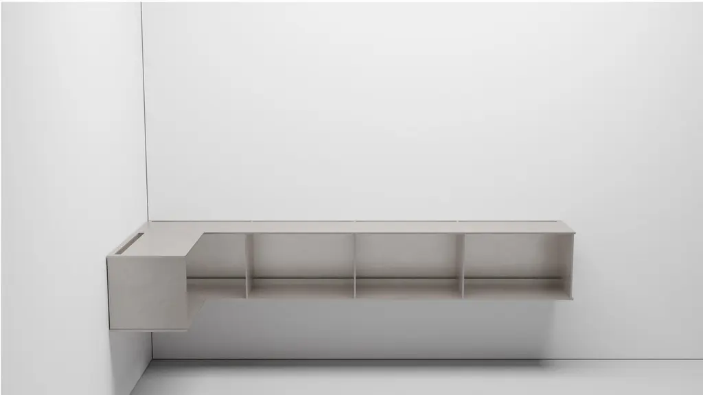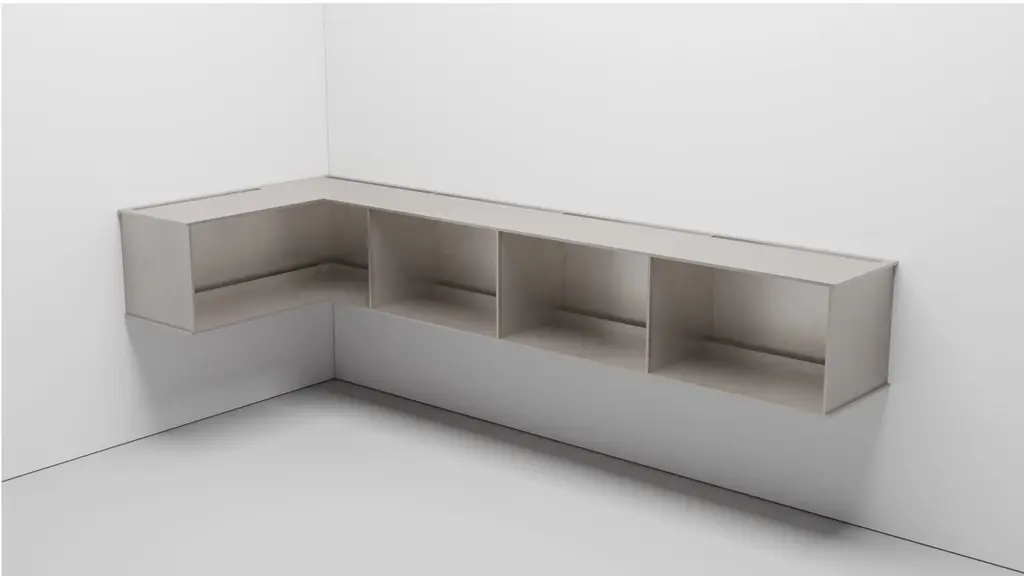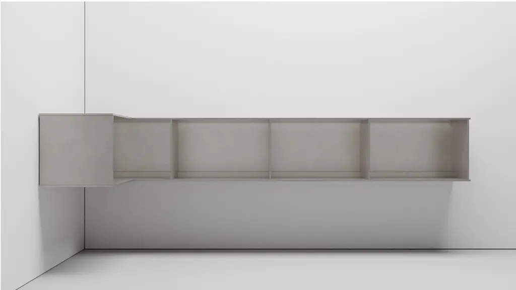 The Minimalist wall-mounted, 95.5 wide, G shelf is sculpted out of 3-8 inch thick, wax-polished aluminum. Each shelf has an inset welded U-channel that spans the length of the shelf and easily mounts on included custom-bent steel Z-clips. The interior openings were made for LP records with openings that are 23.2 inch wide and 14.34 inch high. Depth of the shelf is 15.1 inches. There are cord drops on the back and sides on both top and bottom with vertical stops before them inside the shelves so the records don't touch the cords. This is made to place a record player on the top. The shelf is customizable based on these proportions and can be in 2, 3, 4, 5, 6, 7 and 8 bays. Finish samples, available upon request.