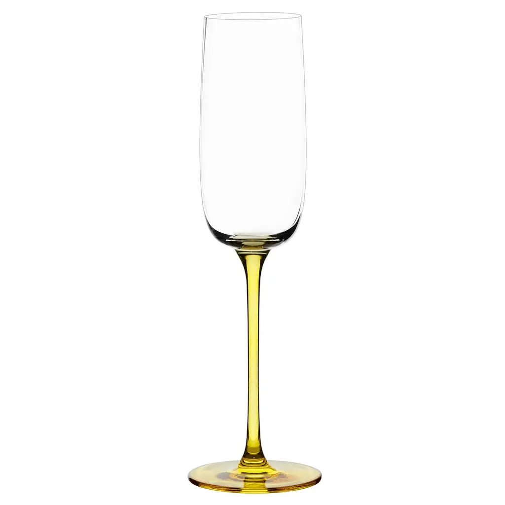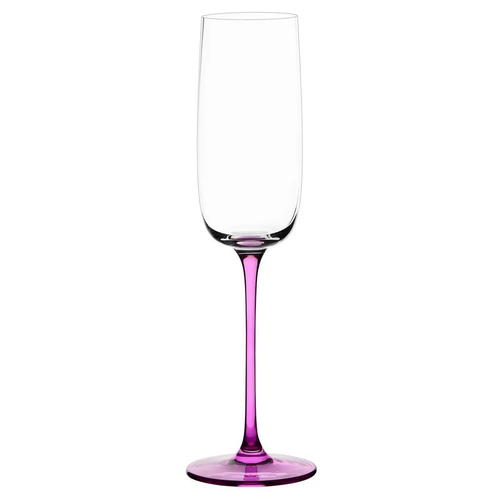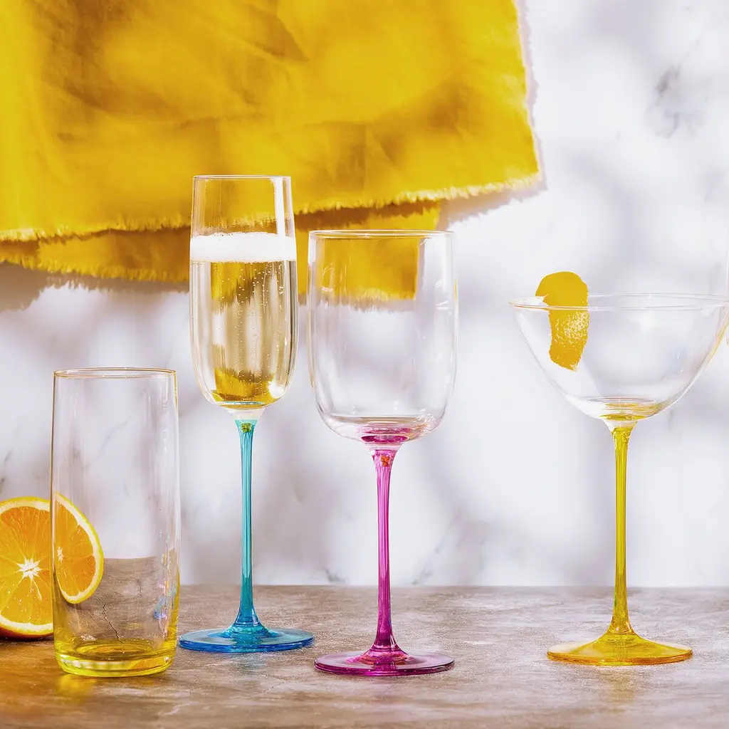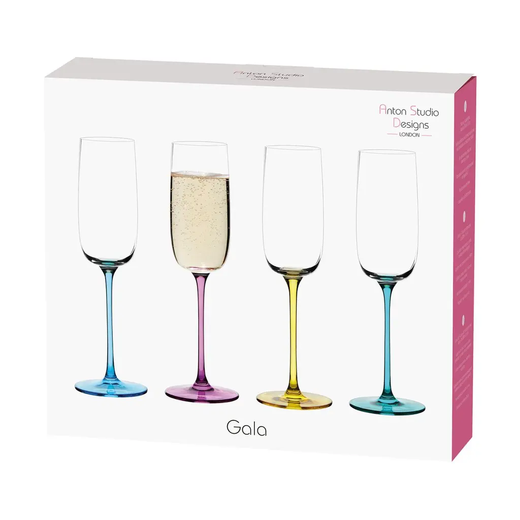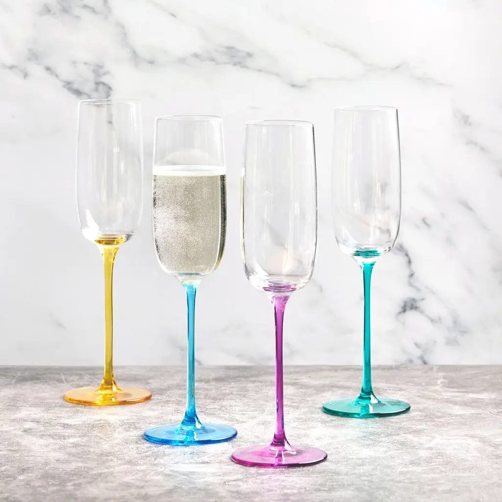 The Gala collection boasts style, color, and sophistication. Each set of four champagne flutes has a shapely bowl and extra fine stems in four jewel colors that sit perfectly together, adding a touch of elegance to your table. Handmade by skilled craftsmen, these flutes are mouth-blown and come gift-boxed. Hand wash only.