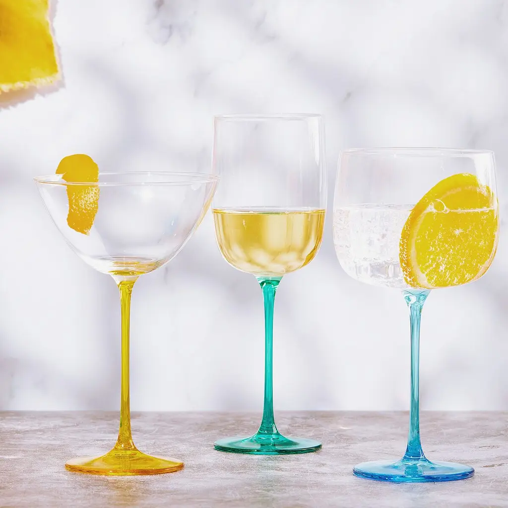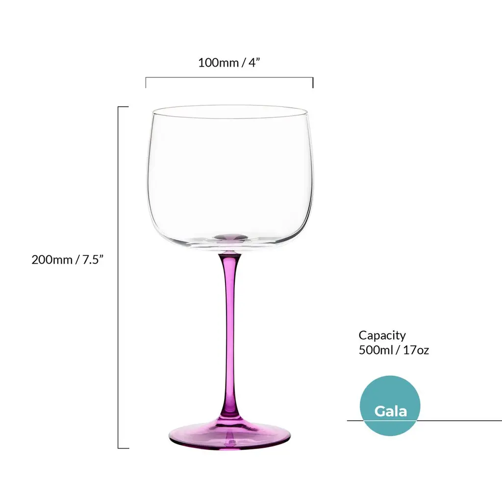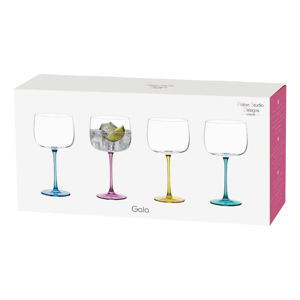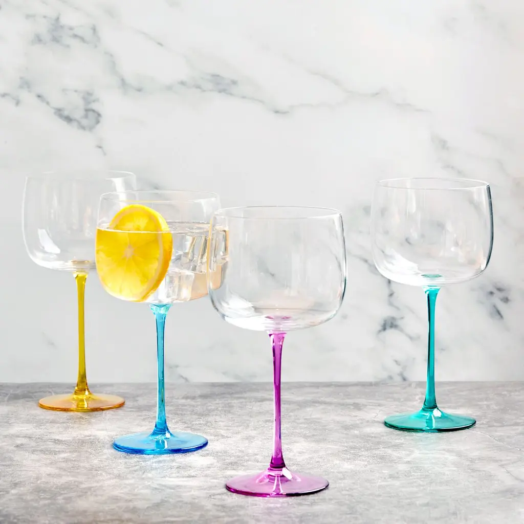 Add a touch of sophistication to your gin experience with the colorful and fun Gala gin glasses. Each set of four glasses has a shapely bowl and extra fine stems in four jewel colors that sit perfectly together. Handmade by skilled craftsmen, these glasses are mouth-blown and come gift-boxed. Hand wash only.