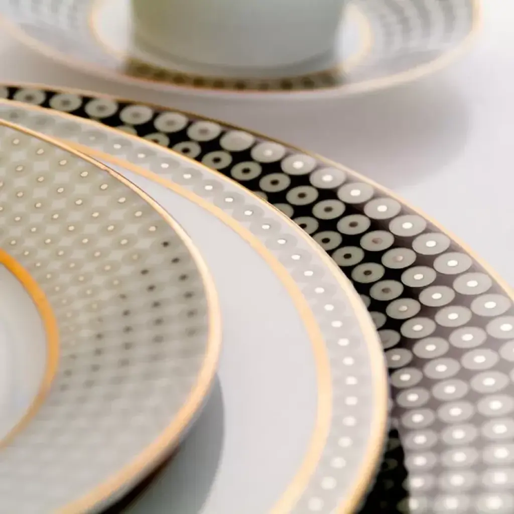 A modern pattern from Royal Limoges, Galaxie dinnerware features round "planets" encircled with matte gold stripes. Five-piece place setting includes dinner plate, dessert plate, bread/butter plate, teacup, and saucer. As the oldest porcelain factory in the French city of Limoges, Royal Limoges boasts a long history of creating hand crafted dinnerware from its own kaolin clay. Since 1797, its exclusive patterns have been enjoyed by clients worldwide.