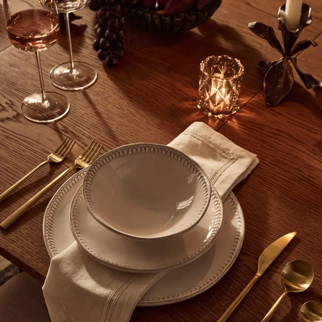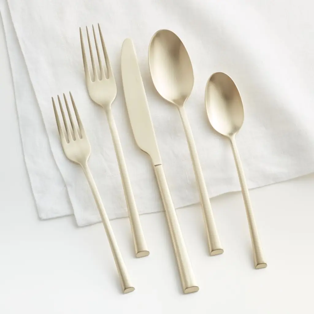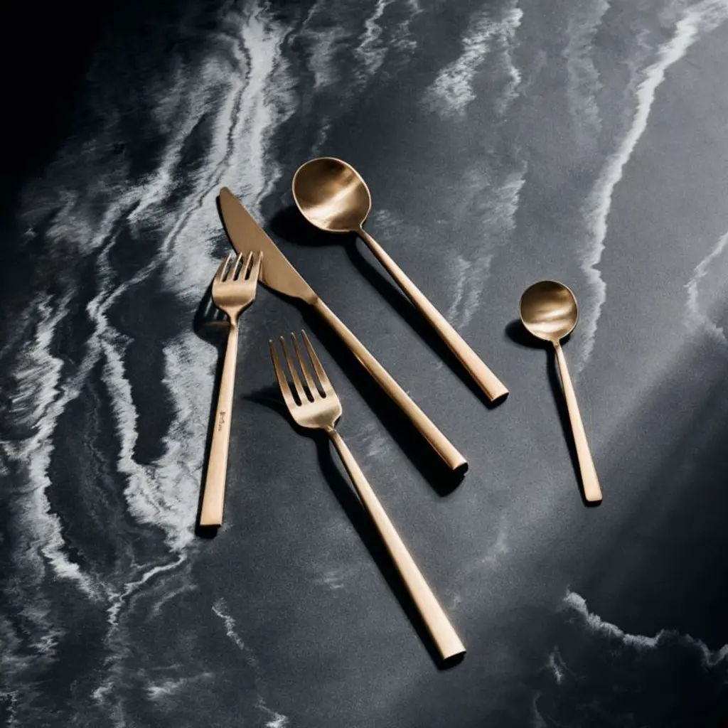 Made of the highest-quality 18/10 stainless steel for superior performance, sleek flatware set sports a satin gold finish and slim ergonomic handles. Each piece is crafted near the Italian Alps by Mepra, a family-owned company founded in 1947 and stewarded by three generations of the Prandelli family. Mepra flatware is frequently found in fine-dining restaurants and the homes of A-list stars due to its design, quality, and exceptional durability. Tested to withstand 400 commercial dishwasher cycles, it's backed by a lifetime warranty. Includes one salad fork, one dinner fork, one knife, one teaspoon and one tablespoon.