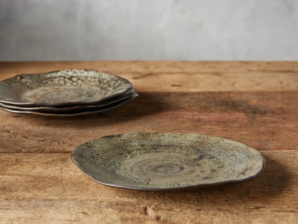 Made by Portuguese artisans, our Gallatin stoneware place setting and serveware collection features a rustic yet stunningly decorated aesthetic, bringing color and pattern to your tablescape through unique detailing. Carefully sculpted pieces are artfully complemented by details that radiate from the center of each dish. A unique, reactive glazed finish creates color gradations in enchanting shades of green, neutrals, and brown. Stoneware place settings are made by Portuguese artisans. Features a reactive, glazed finish. Food safe. Dishwasher safe. Microwave safe. Oven safe. Due to the nature of this collection and its reactive glaze finishes, each piece may vary slightly in color and pattern; adding unique character without affecting performance.