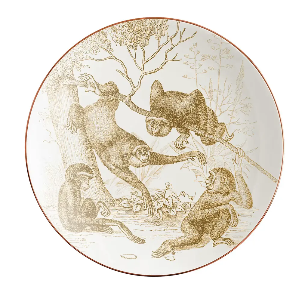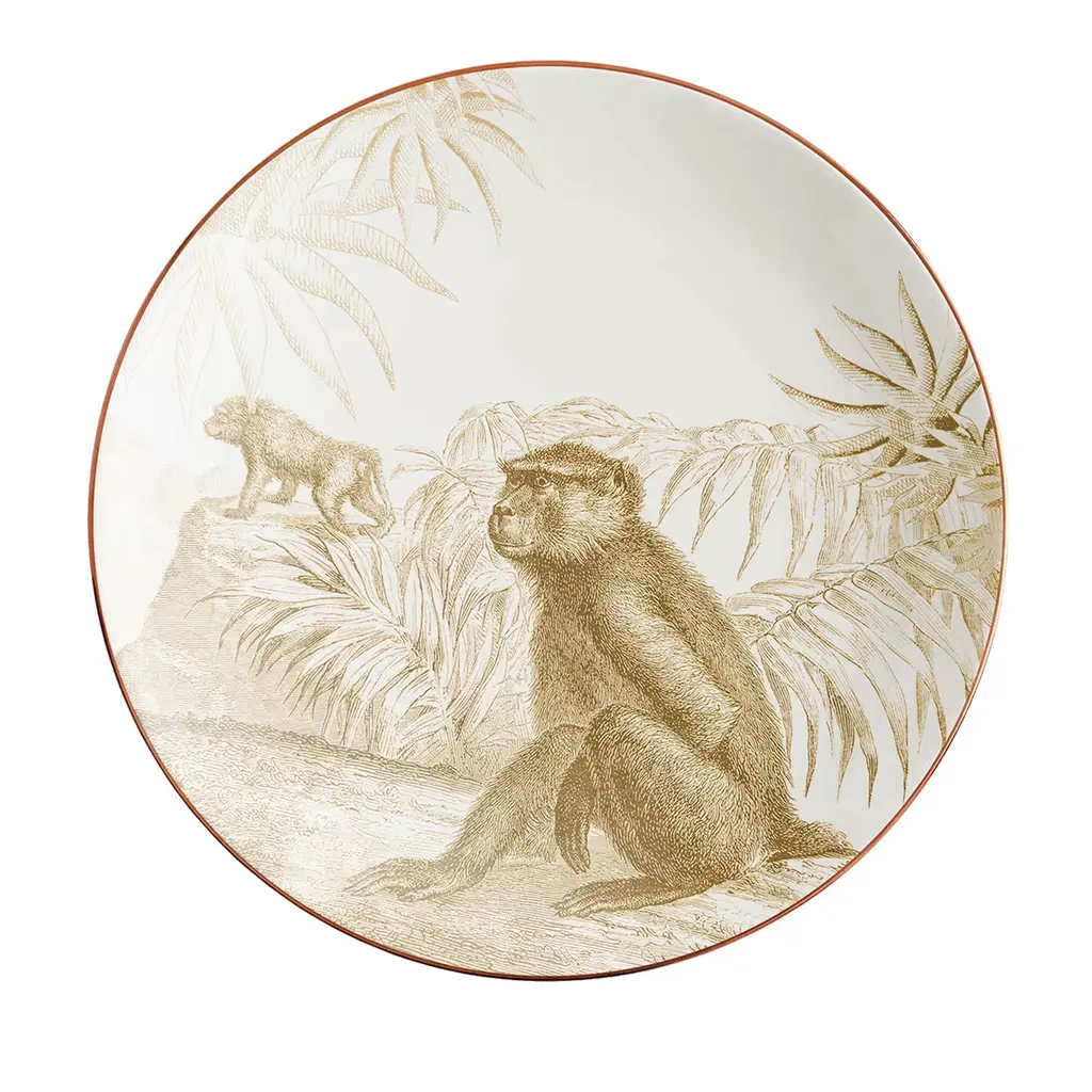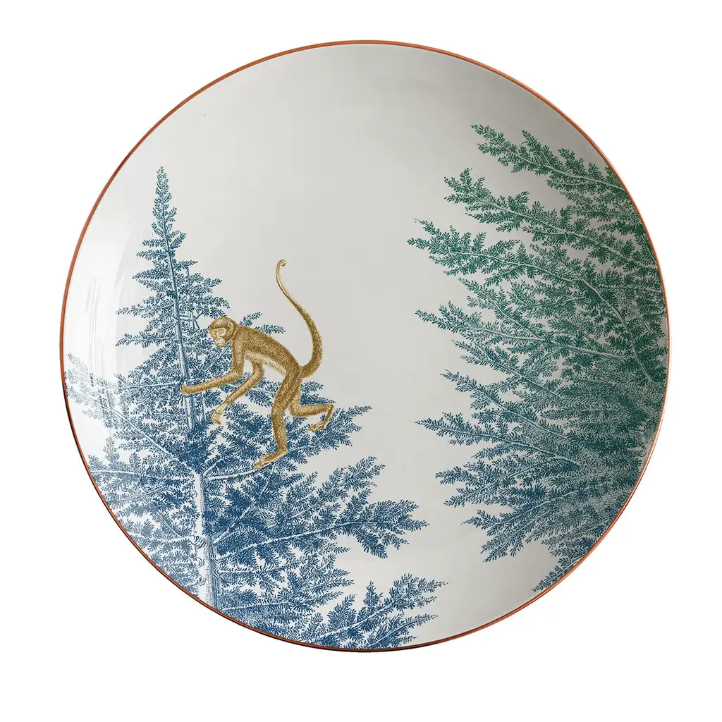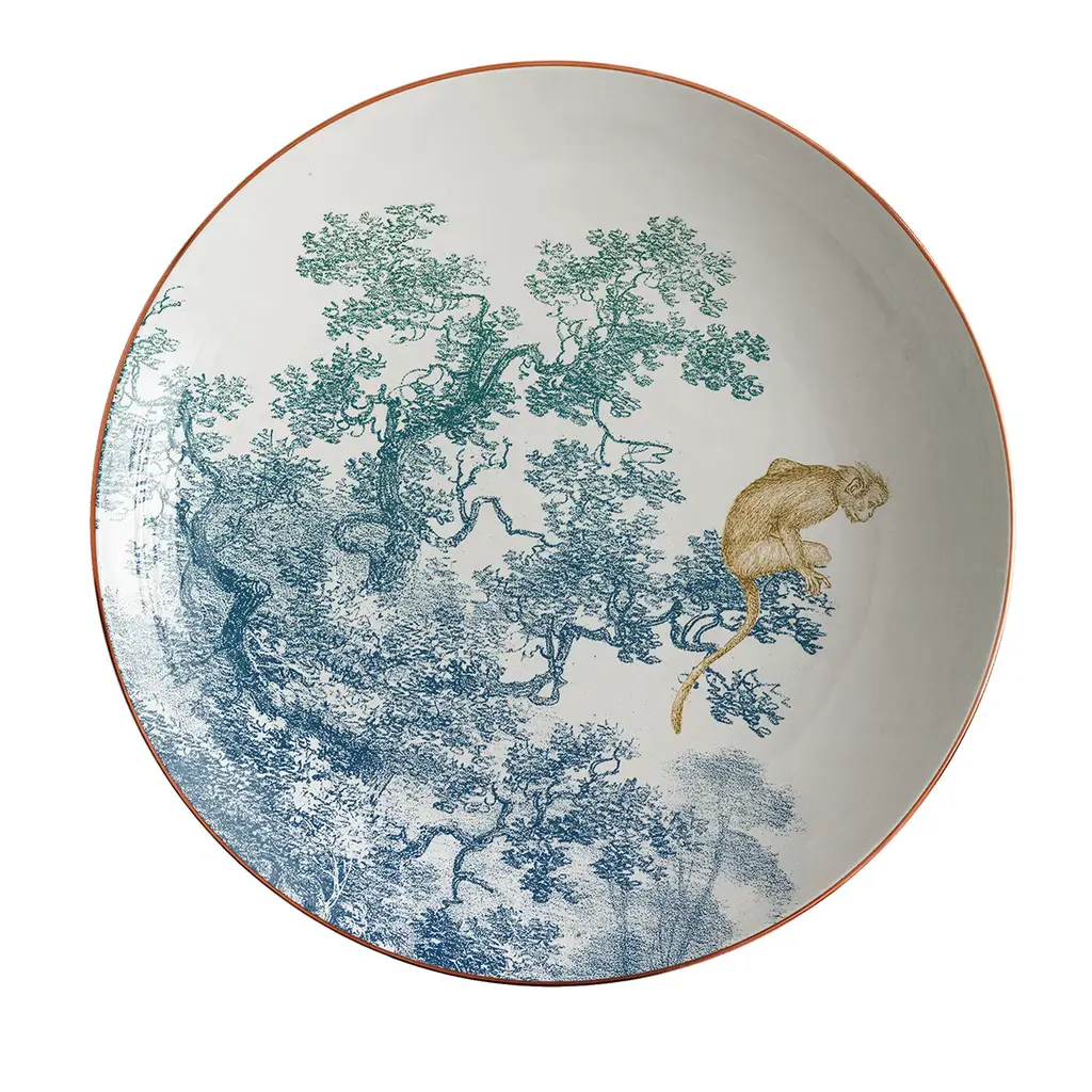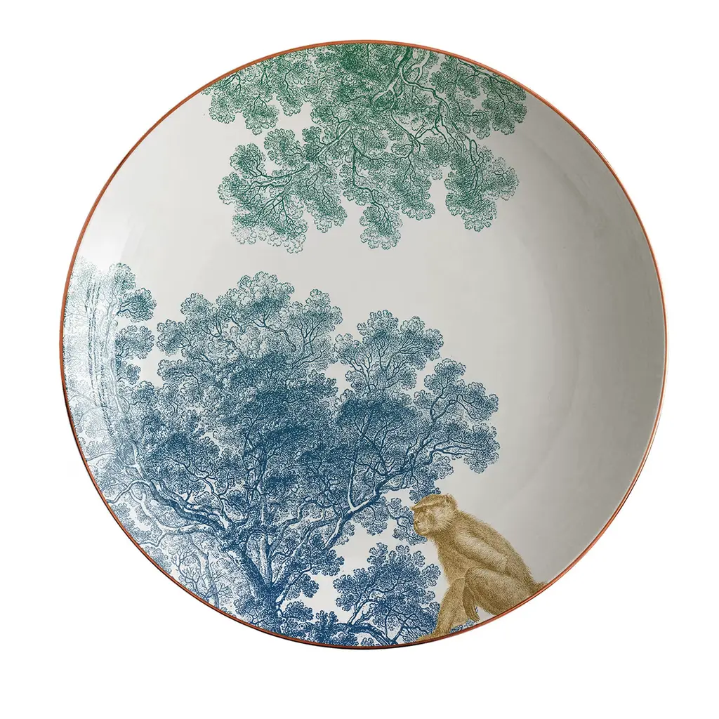 This splendid oval plate will be a gorgeous decorative focal point for any traditional or modern dining room, infusing it with refined sophistication. Part of the Galtaji Monkey Temple series of porcelain tableware, it flaunts an exquisite hand-painted decoration inspired by the namesake Hindu temple. The blue- and green-hued forest is accented with a group of cheerful, sepia-colored monkeys jumping around in the trees.