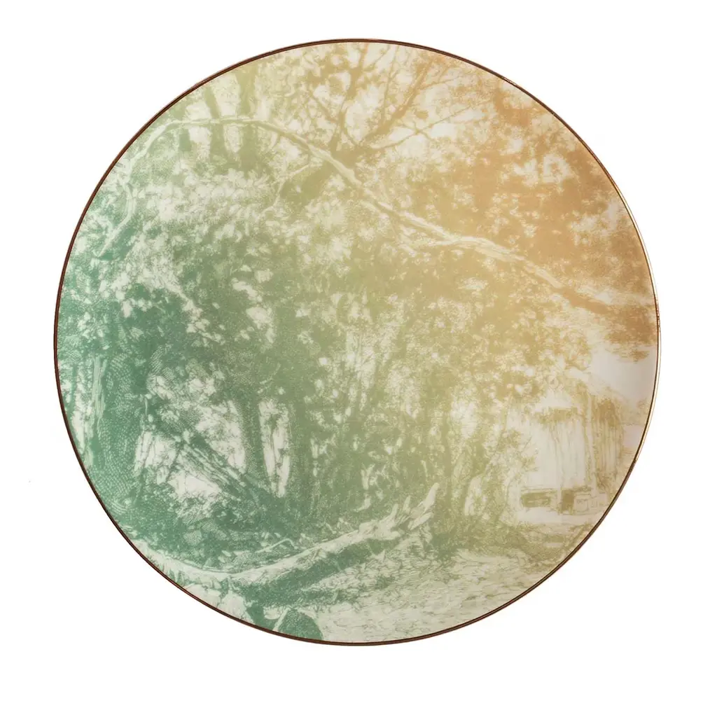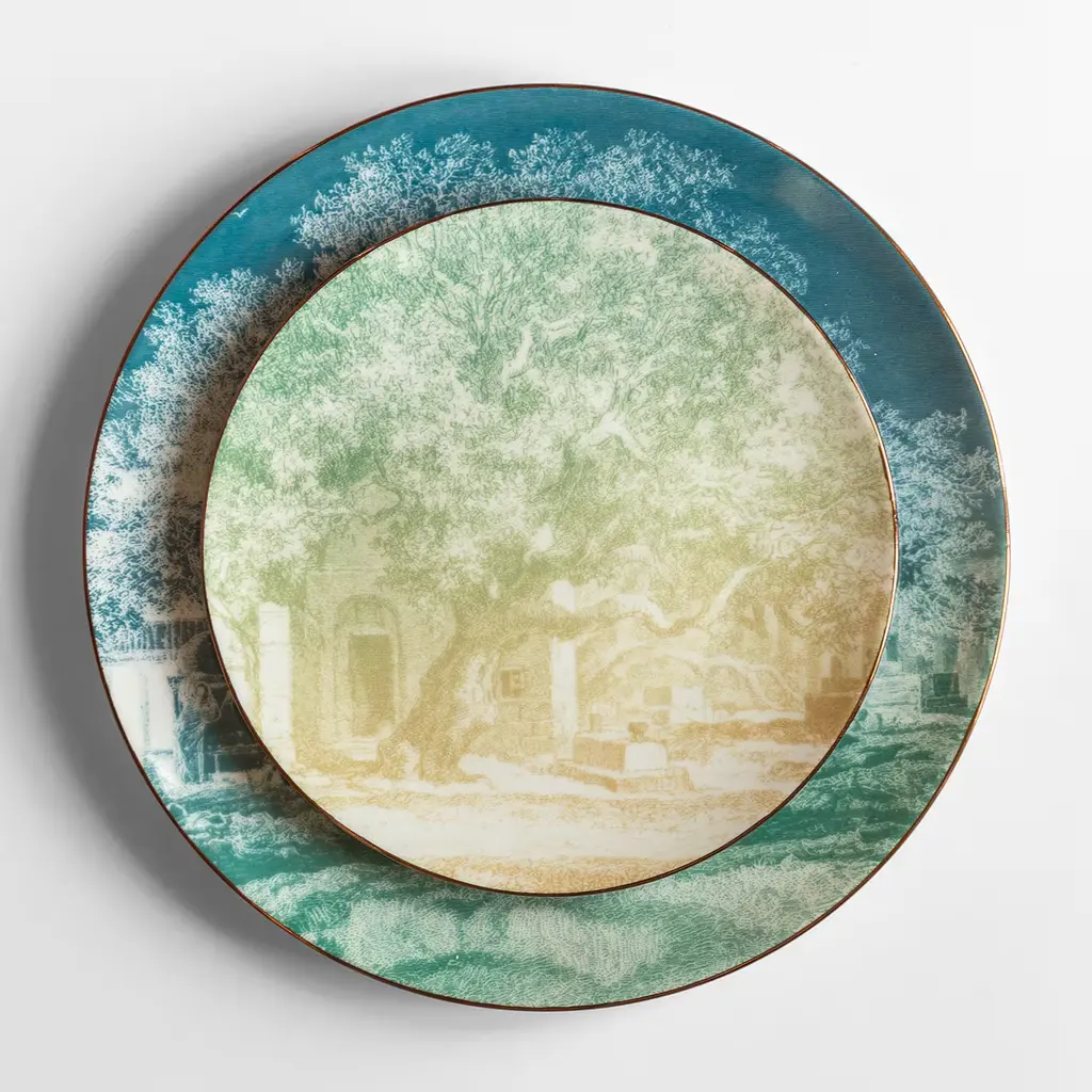 This elegant dessert plate is part of a collection named after the Hindu temple of Galtaji and introduced at Maison&Object 2019 in Paris. It is crafted of porcelain and elegantly decorated with a delicately colored landscape depicting a large tree in front of an old building spreading its branches. Sophisticated and timeless, this is a superb object of functional decor that will enliven an after dinner dessert or an afternoon snack, either in multiples or combined with other designs in the same collection.