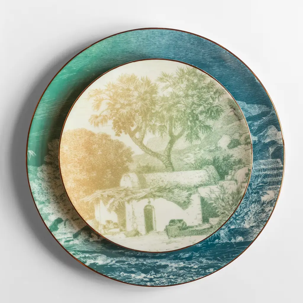 This superb dessert plate is a sophisticated choice for a modern or classic table, where it can be used to serve after-dinner sweets or afternoon treats. Made entirely of porcelain, it boasts a decoration depicting a home embraced by an exotic decorative landscape. It is part of the Galtaji-Monkey Temple Collection introduced at Maison&Objet 2019 in Paris, inspired by the luscious landscape around the namesake Hindu temple. This stunning piece can be combined with others in the same series for a magnificent effect and served alongside the dinner plate collection.