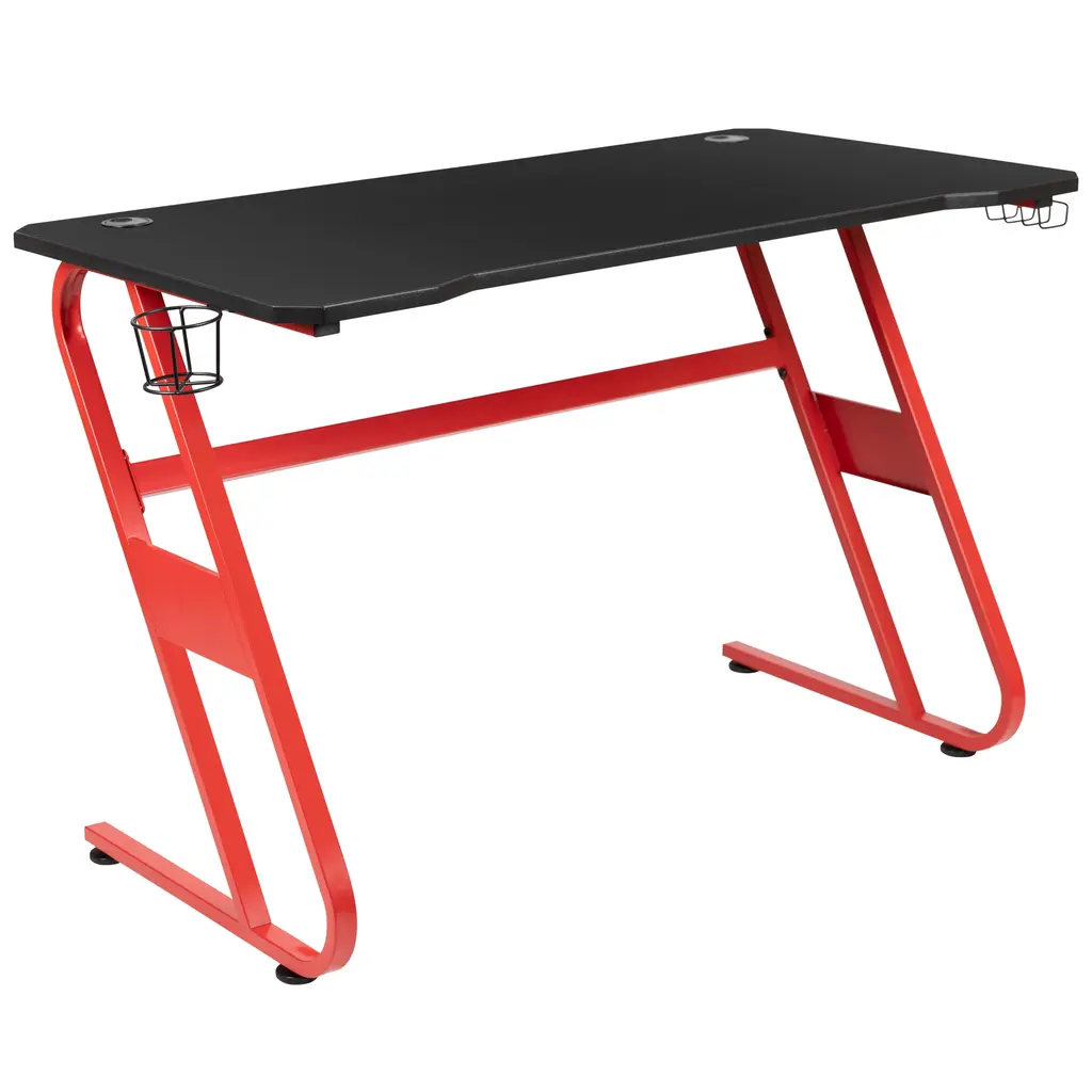 Let the games begin on this gaming desk and chair set. A sleek, z-frame offers stability and style for a cool looking desk setup. The gamers table has two grommets for cable management, a detachable cup holder and headset holder to keep you in game mode. The racing game chair have flip-up arms to comfortably rest your arms on while handling the controller or flip-up to slide under the desk. Be true to the gaming experience with a desk and chair combo designed for gaming systems. A spacious desktop that can hold up to 2 monitors adds more excitement to the game. Use the cup holder to prevent beverages from spilling on your pc gaming keyboard. The comfortably padded ergonomic gaming chair has a full swivel cylinder and adjusts with the pneumatic lever. Tilt back with ease by pulling the lever outward, control the force needed to recline by turning the knob underneath the seat. Made for gamers, this gaming desk and chair bundle will get you on your way to leveling up.