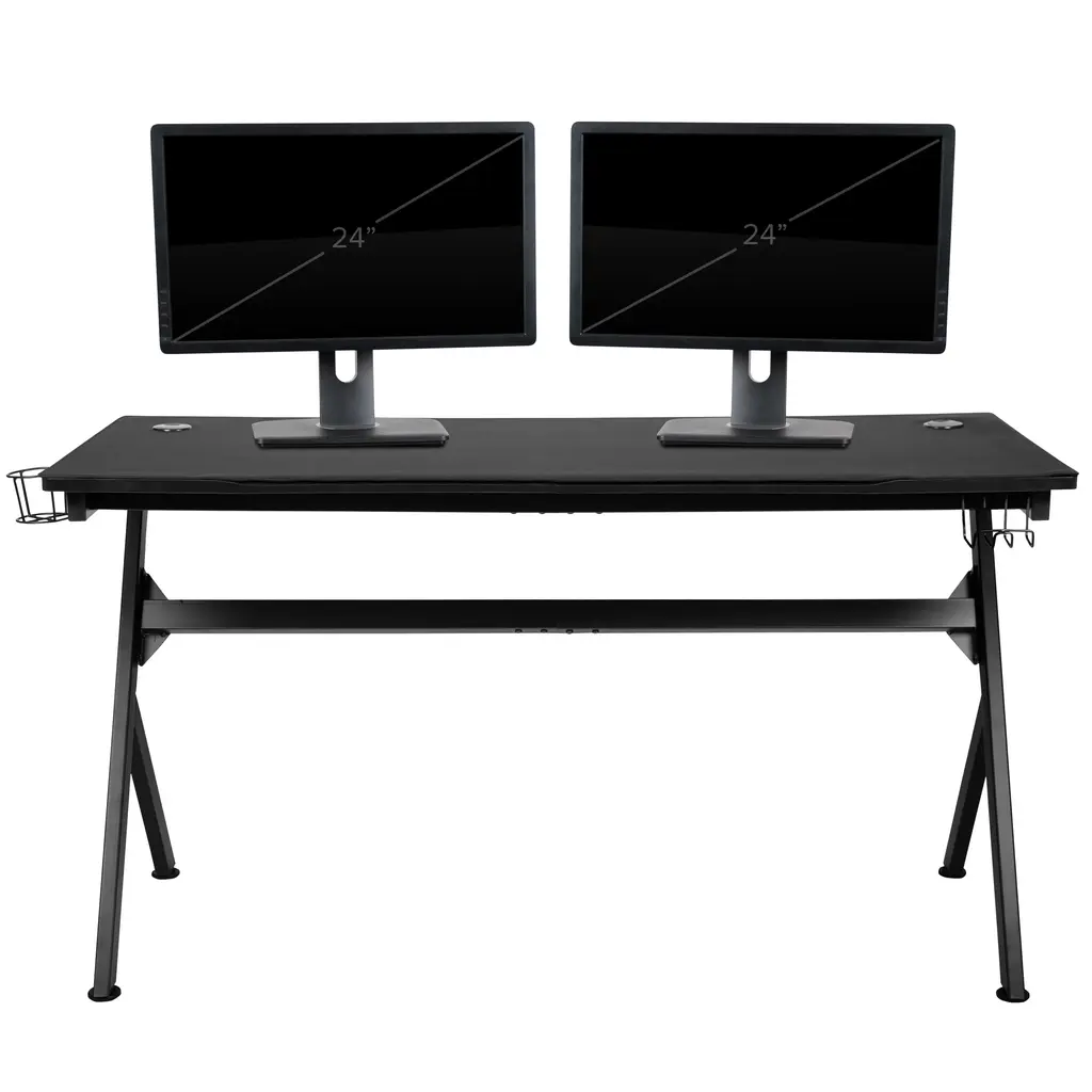 Let the games begin on this gaming desk and chair set. The extra large The gamers has 2 grommets for cable management, removable mouse pad top, a detachable cup holder and headset holder to keep you in game mode. The racing game chair have flip-up arms to comfortably rest your arms on while handling the controller or flip-up to slide under the desk. Be true to the gaming experience with a desk and chair combo designed for gaming systems. This PC gaming desk has ample space for dual monitors. Use the cup holder to prevent beverages from spilling on your pc gaming keyboard. The comfortably padded ergonomic gaming chair has a full swivel cylinder and adjusts with the pneumatic lever. Tilt back with ease by pulling the lever outward, control the force needed to recline by turning the knob underneath the seat. Made for gamers, this gaming desk and chair bundle will get you on your way to leveling up.