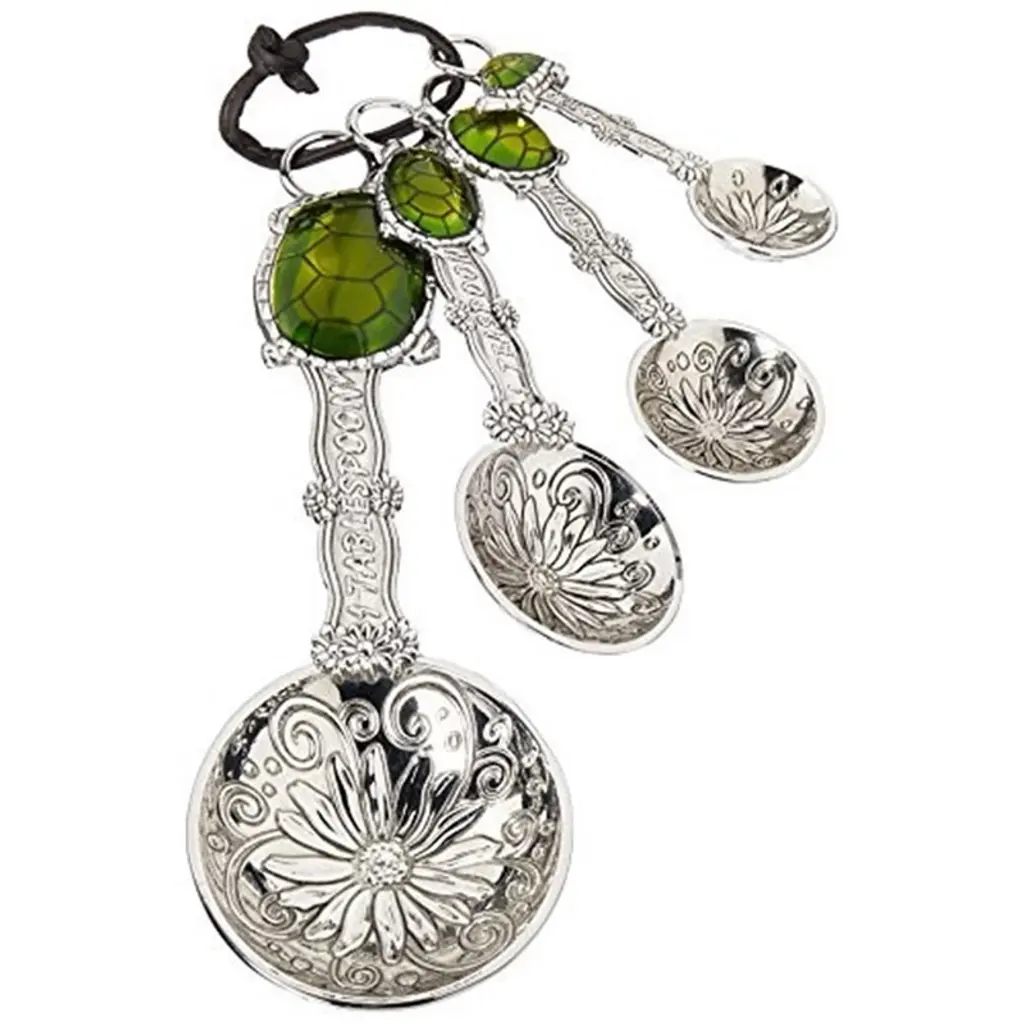 This is the perfect gift for almost any cook, bride, birthday or house warming. Each spoon has an exquisite detailed design on both the front and back. These spoons provide a unique combination of style and function. Manufactured from a sturdy zinc alloy. Each spoon handle is decorated with a green turtle design. The spoon set includes: 1/4 teaspoon (3 inch), 1/2 teaspoon (3.25 inch), 1 teaspoon (4 inch), 1 tablespoon (5.25 inch). Dishwasher safe, hand wash recommended. Wonderful detail and accurate measurements.