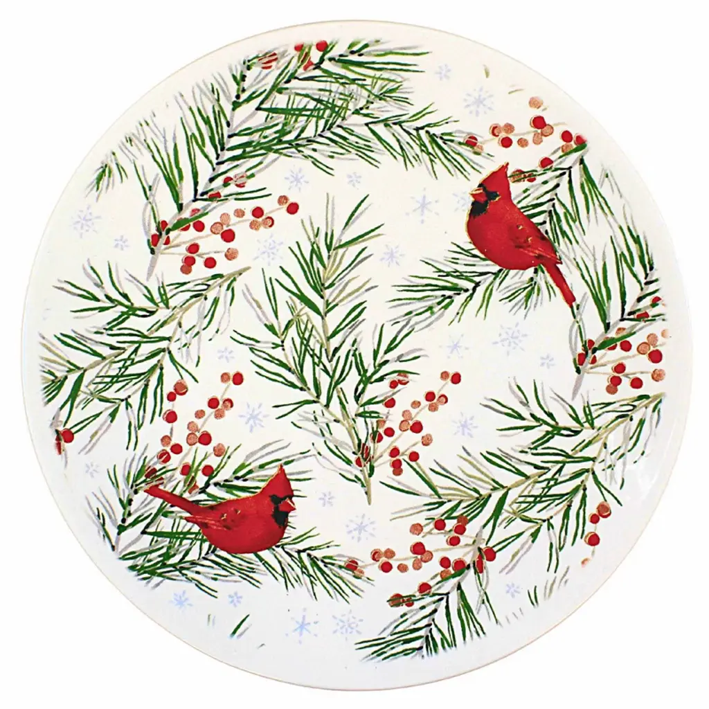 The Cardinal Snack Plates from Ganz bring festive cheer to your holiday gatherings. Featuring a beautiful design of two cardinals perched on pine fur branches with berries, these plates are perfect for serving appetizers, salads, or desserts. With a 7.75-inch diameter and sturdy 0.75-inch height, they’re just the right size for your seasonal treats. Packaged in a cardboard box, these plates also make a delightful gift for any holiday host. Measures Approximately 7.75 In H X 7.75 In W X 0.75 In D (HxWxD). Includes Set Of 4 Snack Plates.
