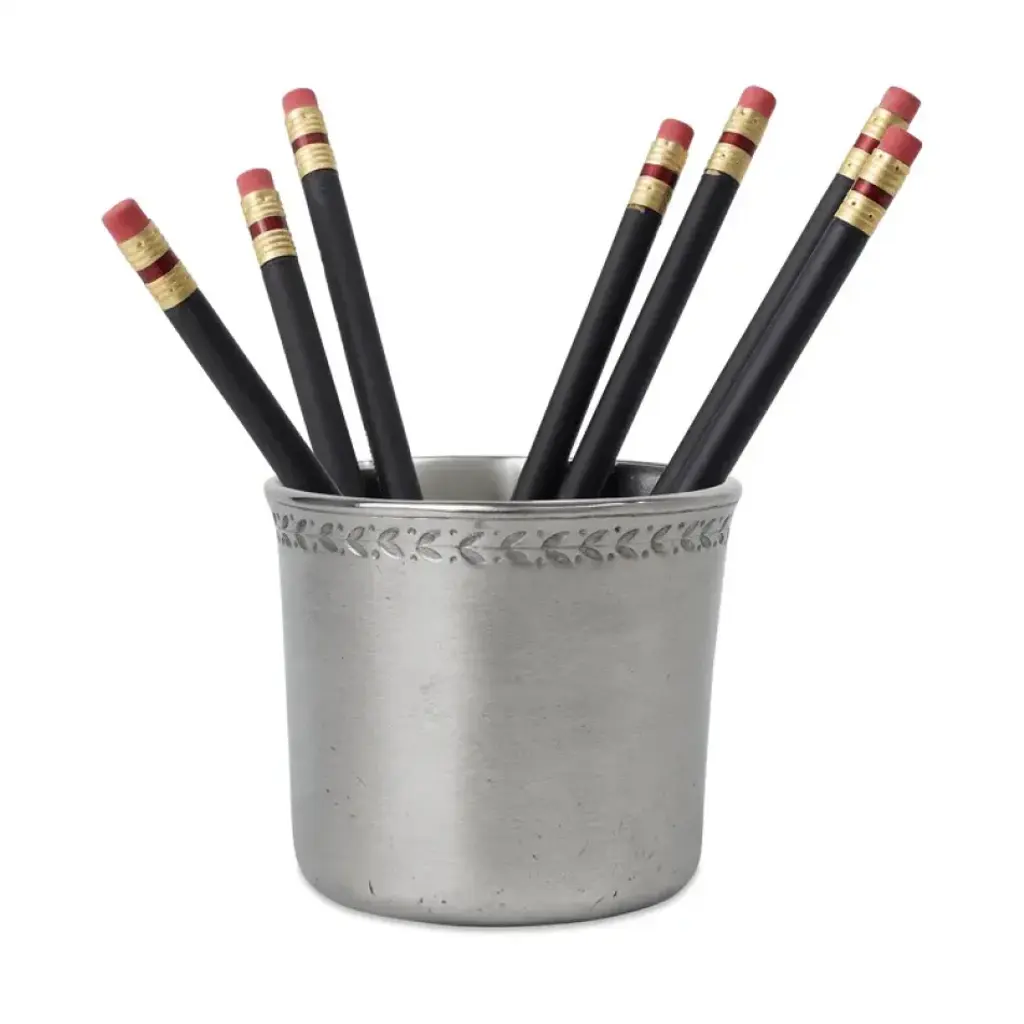 With its charming leaf motif, this pewter cup makes a graceful home for anything it holds. Whether it's pencils or even a petite bouquet for the bedside or desktop. When David Reiss - a graduate of the Rhode Island School of Design - founded MATCH in 1995, he introduced America to the beauty of Italian pewter. MATCH’s pewter, a valuable metal composed of tin, copper, and antimony, is handmade by artisans in Northern Italy. Each piece is made with an alloy that is food safe, lead free, FDA approved and requires very little care. Every piece of Match pewter is marked with the manufacturer's "M" hallmark as well the mark of tin content "95".