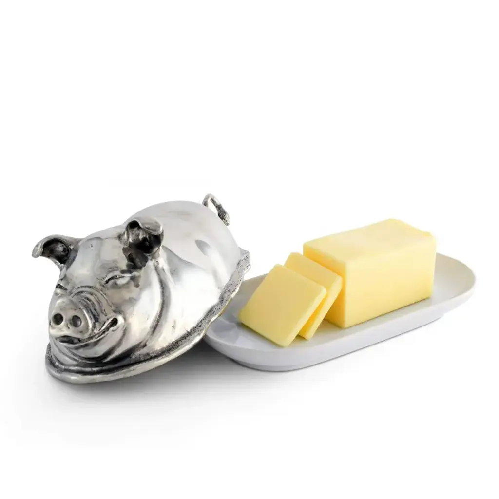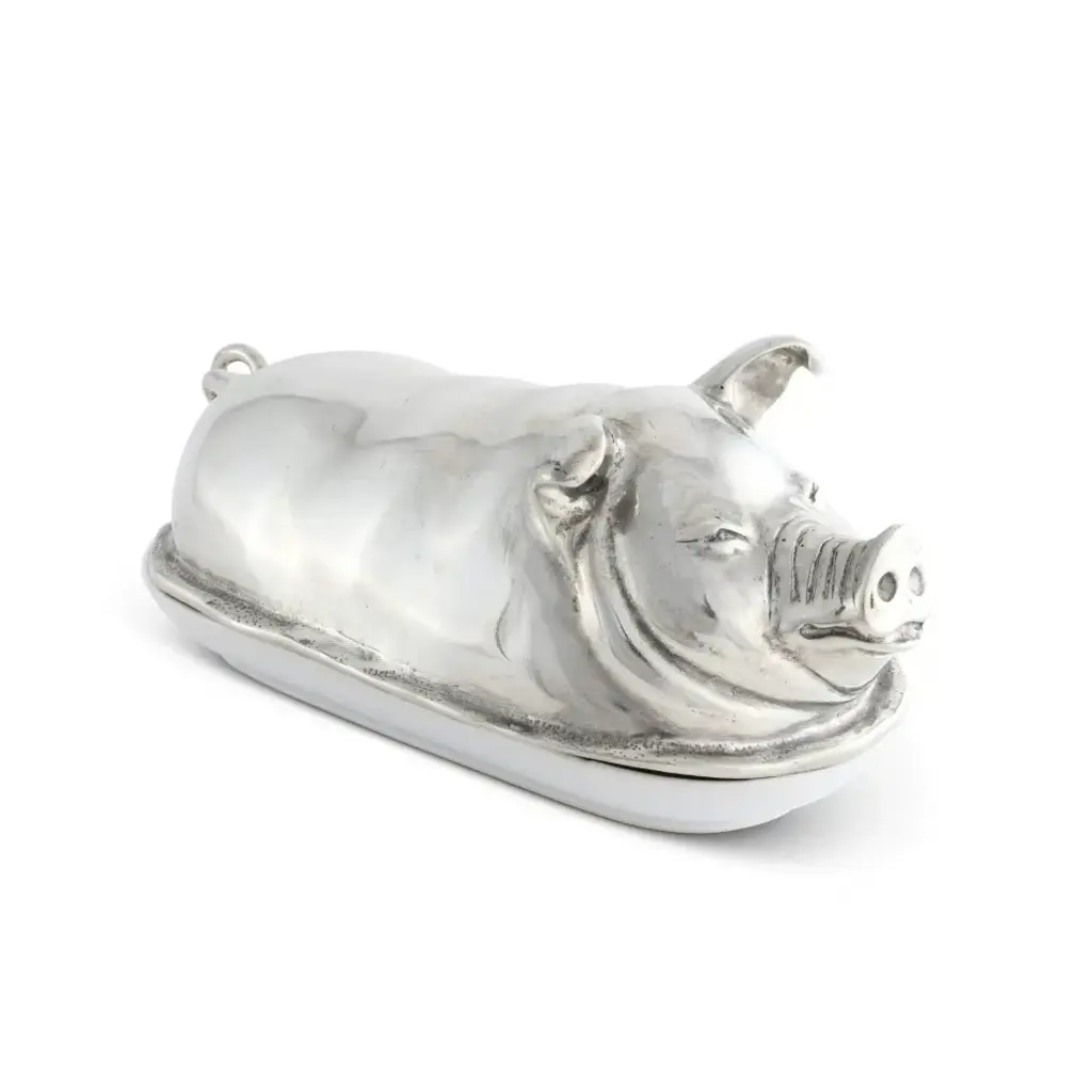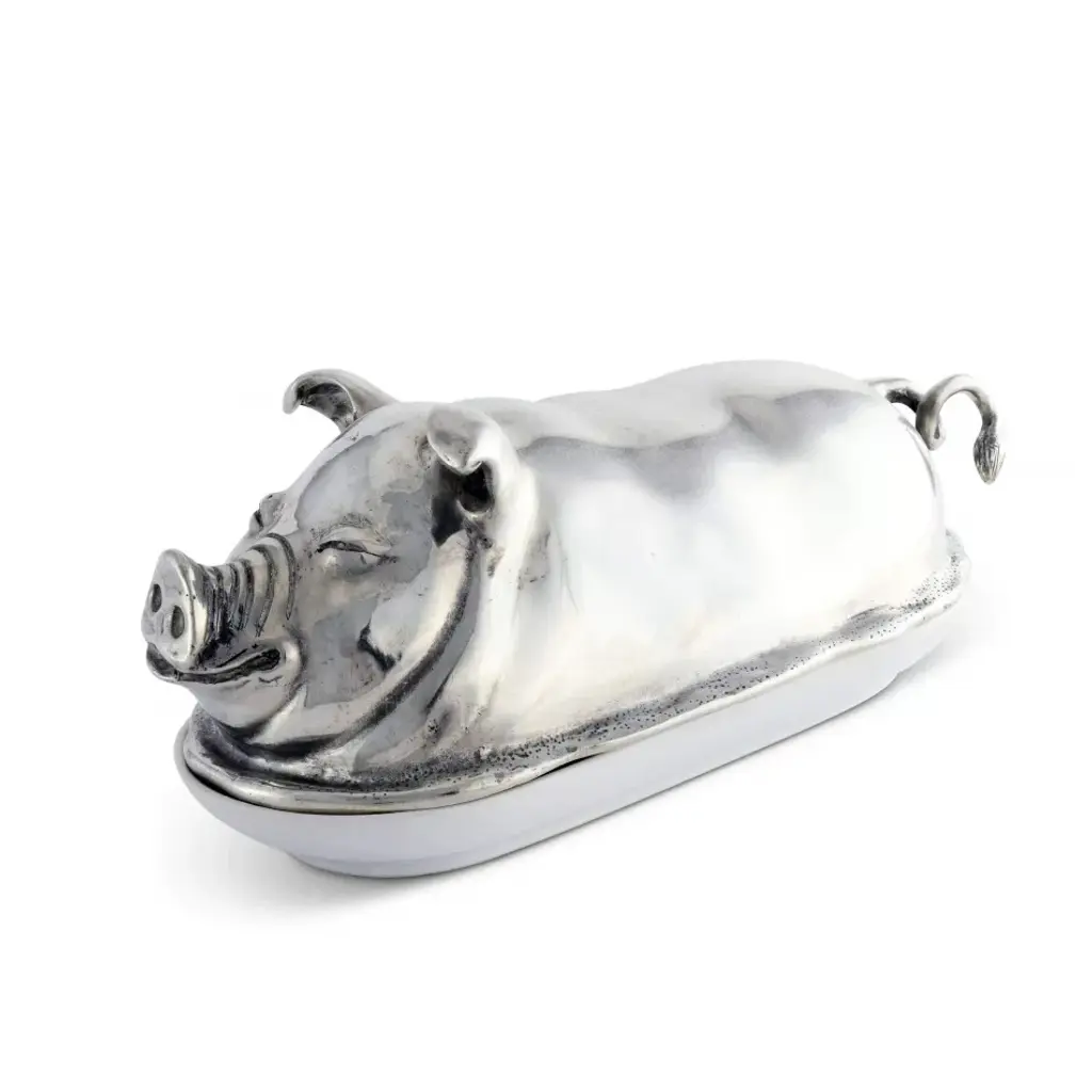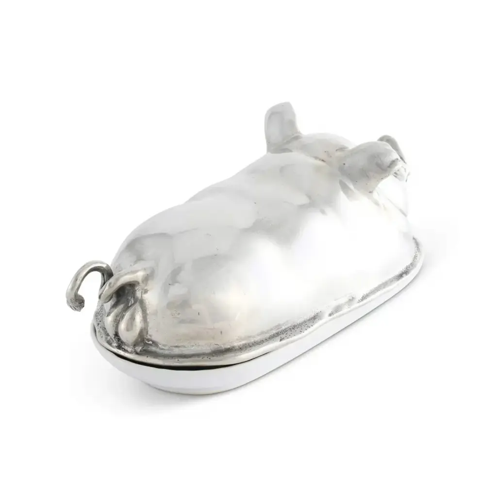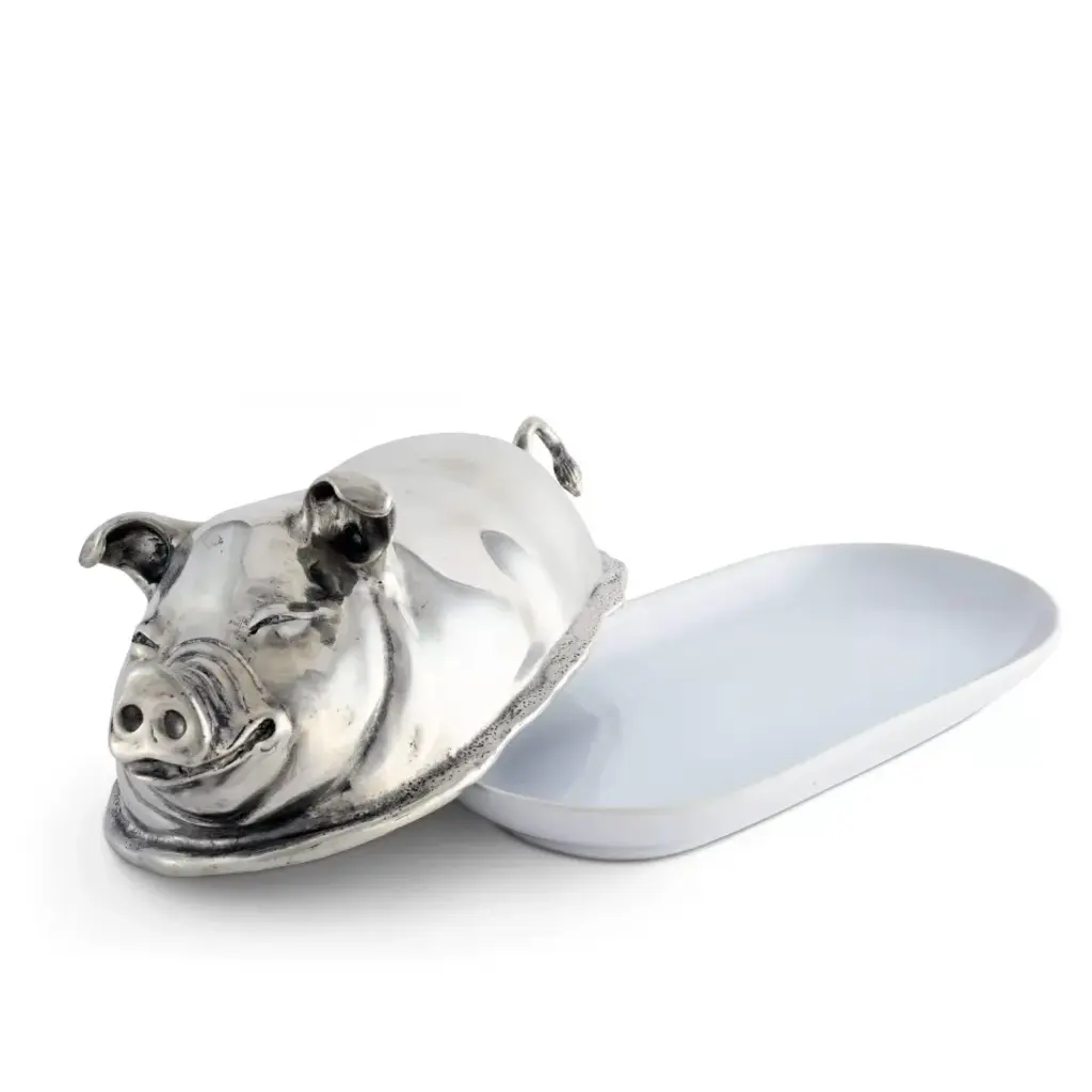 Vagabond House's Happy Pig delights everyone with charming design. Crafted in luxury-grade pewter, this Happiest of Pigs has floppy ears, a large, triangular nose, a squiggly tail and a satisfied smile. Holds all standard American and European butter sizes Vagabond House is a family-owned American company specializing in fine pewter tableware, servingware and giftware. Largely inspired by nature, their exclusive products are designed to be unique, functional heirlooms for those who seek to express tradition and style in both family and formal entertaining.