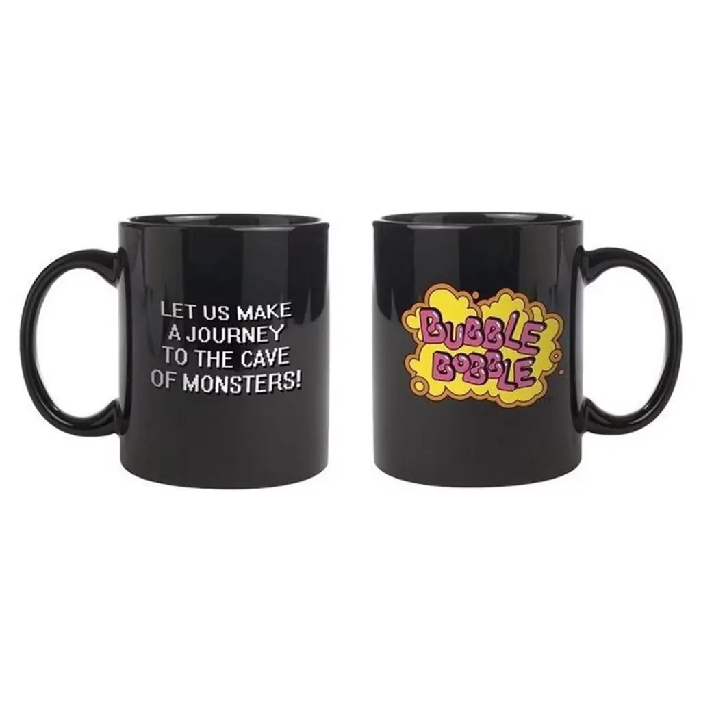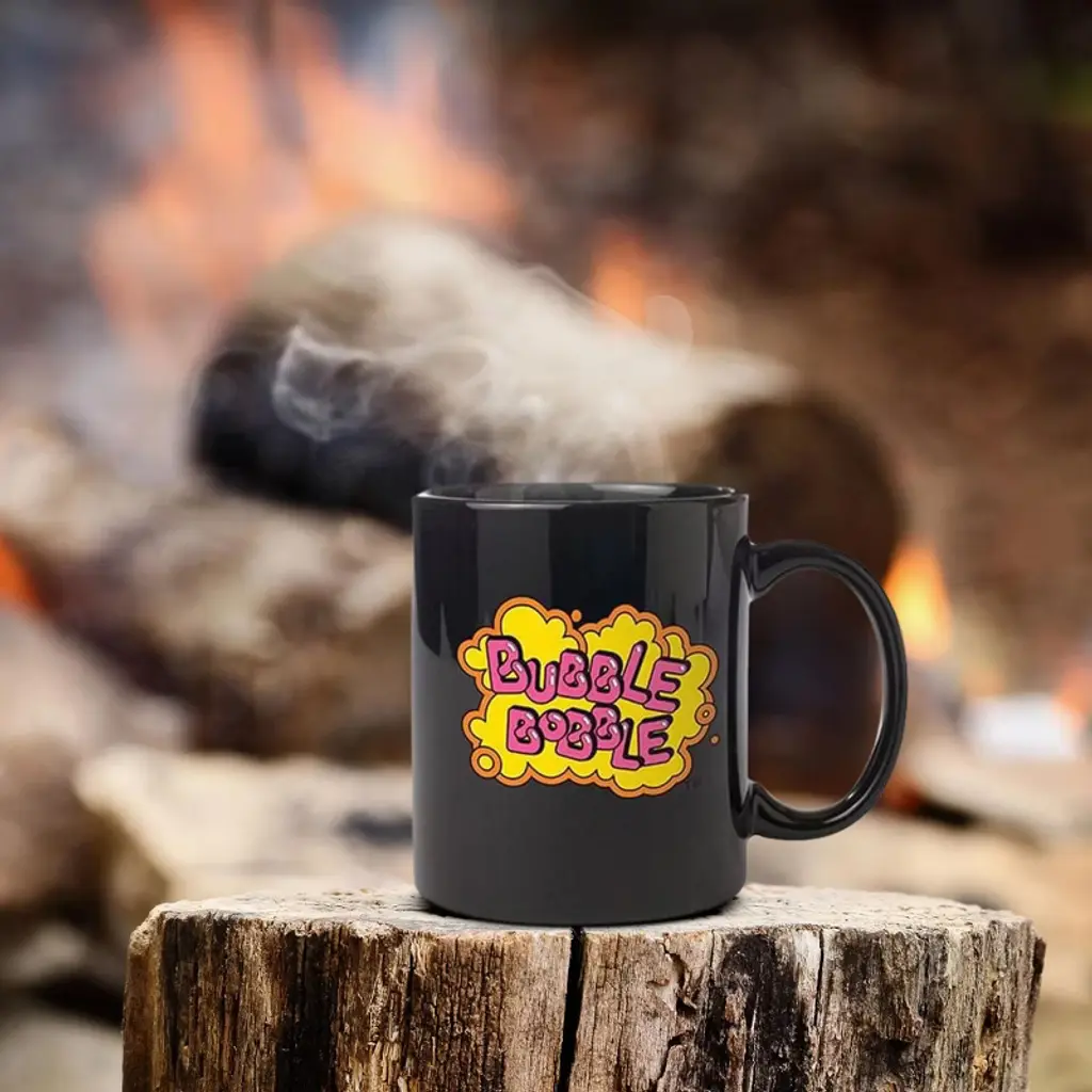 Show off your love of retro video games with this stylish coffee mug! Black mug shows off the logo for Bubble Bobble. Standard size ceramic mug, dishwasher and microwave safe. Officially licensed. Sure to make a great gift to any Bubble Bobble fan!
