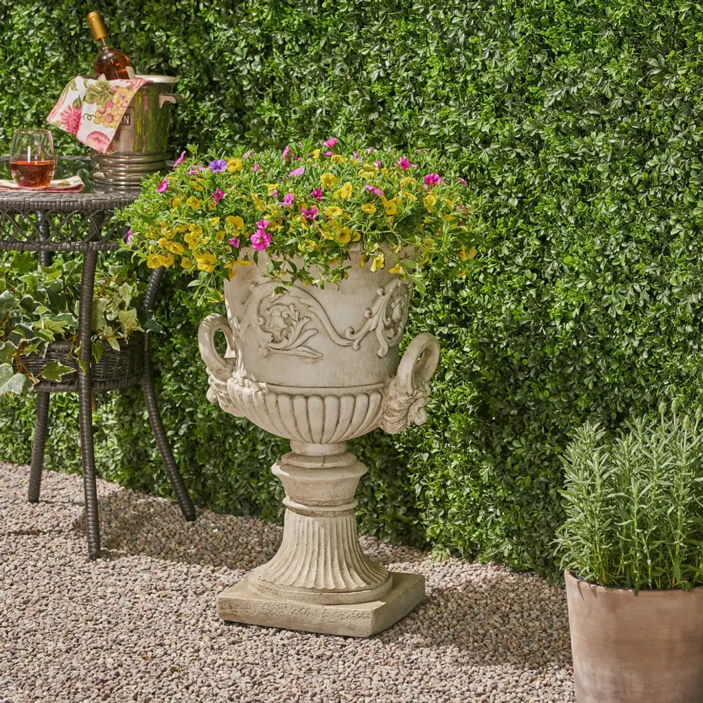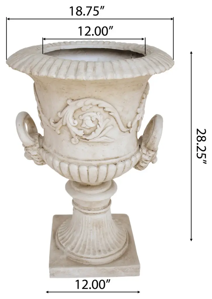 Pick your plants up off the ground; this garden urn planter allows for variation in height in your garden area, re-invigorating your yard and giving it a sense of new interest and excitement. A drainage hole and stopper helps keep everything planted in this garden urn healthy and happy.• • ELEGANT STYLE: Lightweight concrete gives this planter a high-end, faux-stone appearance. This piece boasts a Roman design with botanical accents and a square base.• MULTI-PURPOSE: This planter can be used for flowers, herbs, succulents, and vegetables.• FUNCTIONAL: This selection is outfitted with a drainage hole and stopper for optimal growing conditions.• DURABLE: This piece is weather and water-resistant, making it perfect for homes of any climate. It is suitable for both indoor and outdoor use.• NO ASSEMBLY REQUIRED: Simply remove this planter from its packaging and enjoy.• Includes: One (1) Outdoor Urn PlanterMaterial: Lightweight ConcreteColor: Antique WhiteHand-Crafted DetailsNo Assembly RequiredProduct Dimensions: 18.75 inches deep x 18.75 inches wide x 28.25 inches high