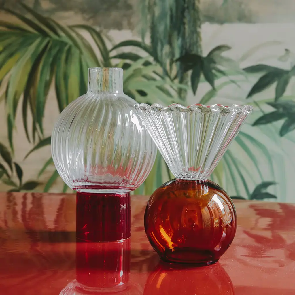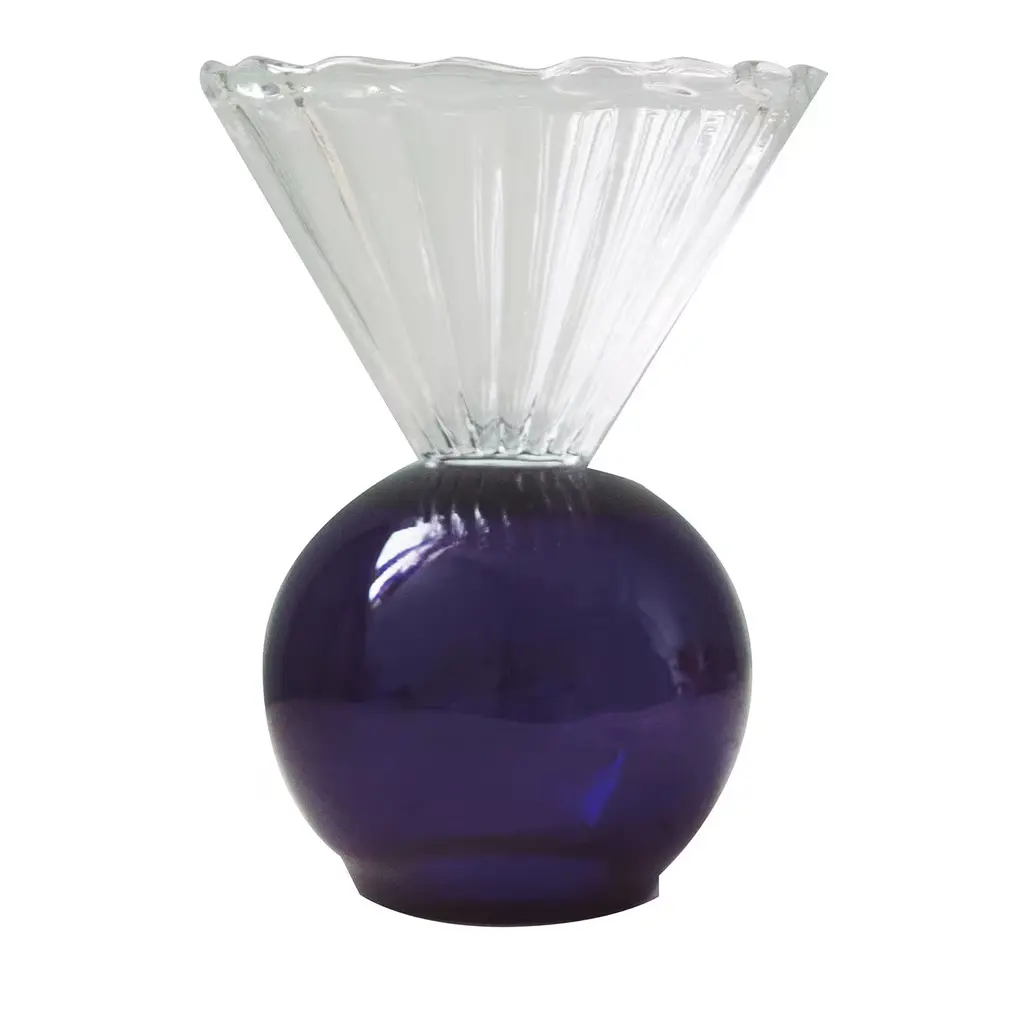 This exquisite ice-cream bowl belongs to a series of pieces designed for serving fruit salads, ice-cream, or to display minimalist flower compositions. Entirely handcrafted of crystal, the clear conical element marked by a ridged texture is set on a deep amber-hued semi-spherical base. This precious tableware item can be combined with twins in different color variants for a lively and cohesive look.