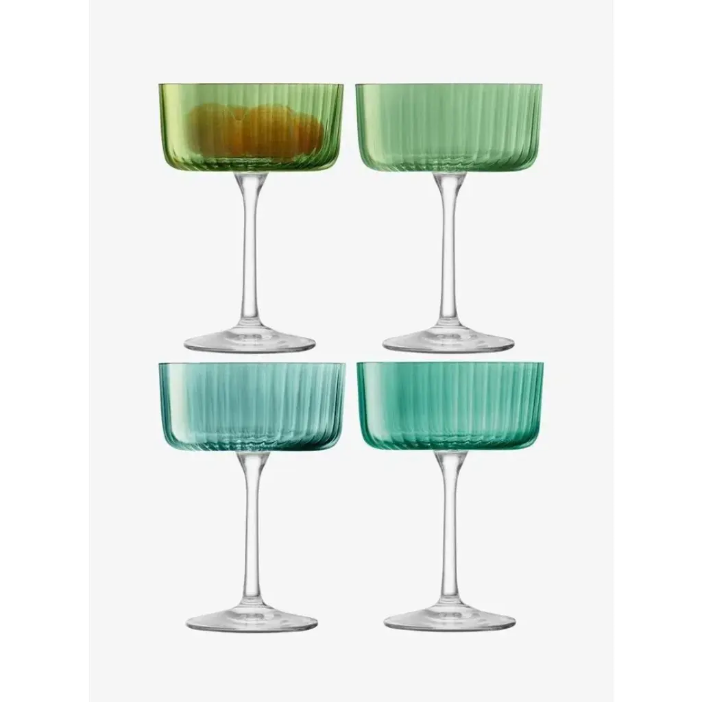 A set of textured wine glasses with fine walls, painted by hand in assorted tonal lustres.
