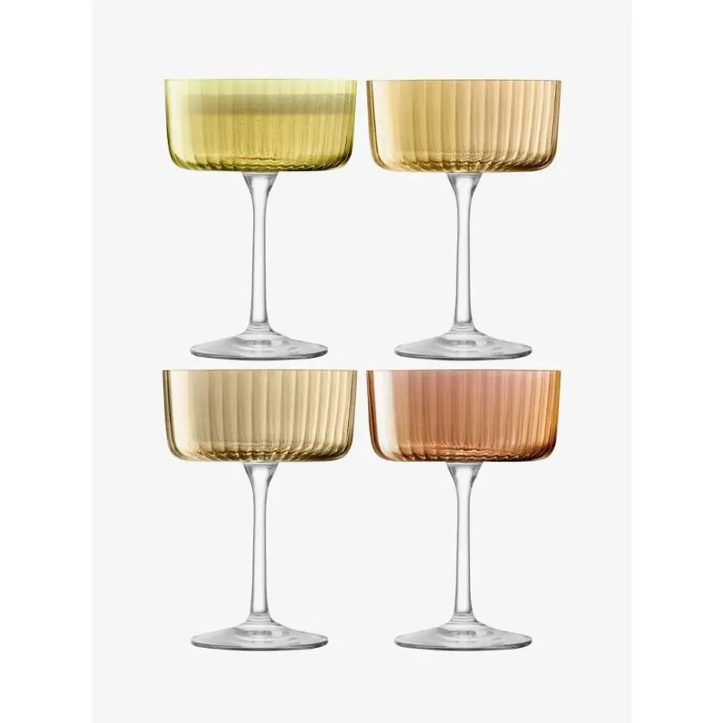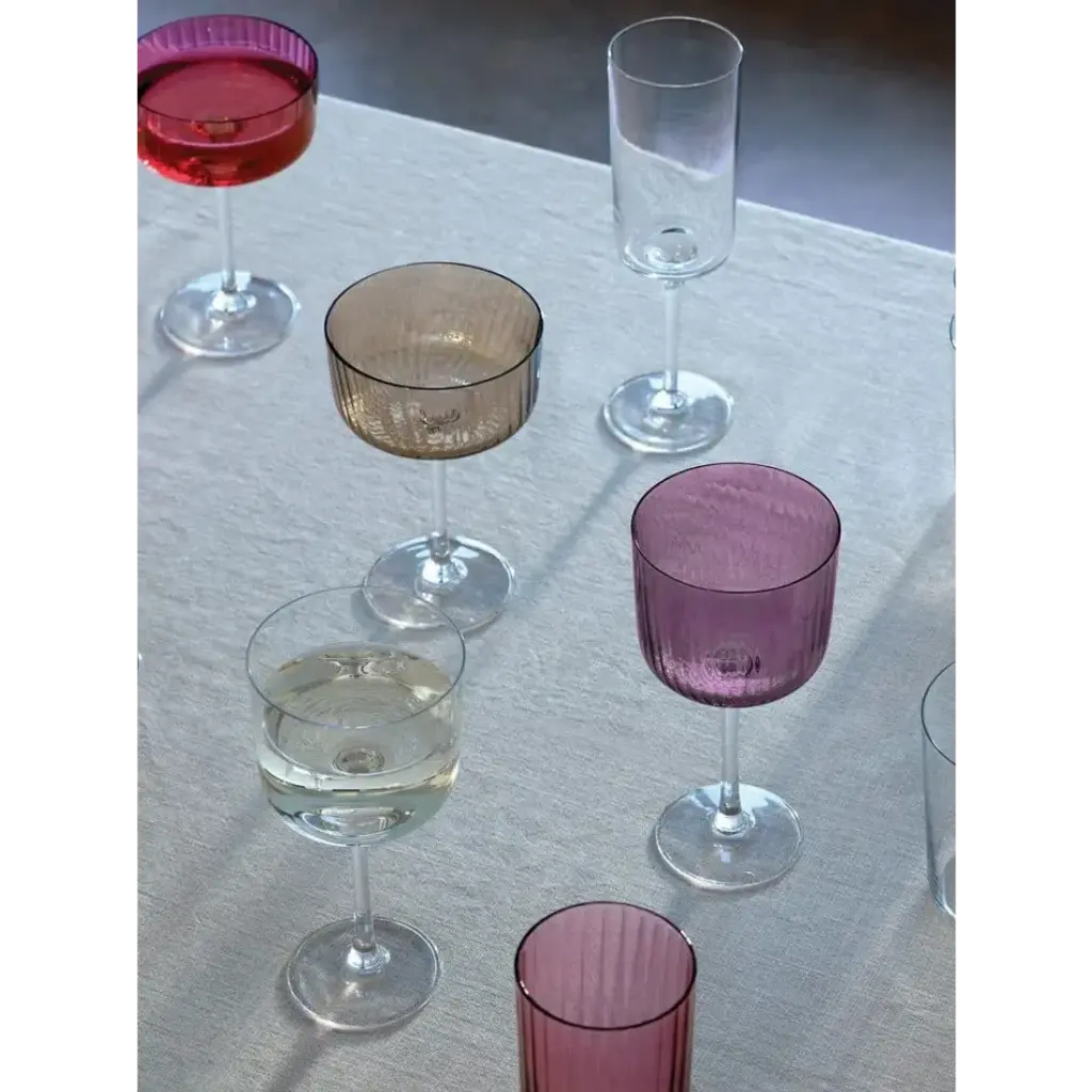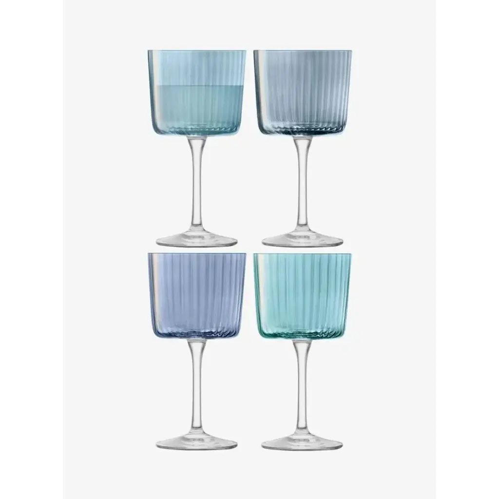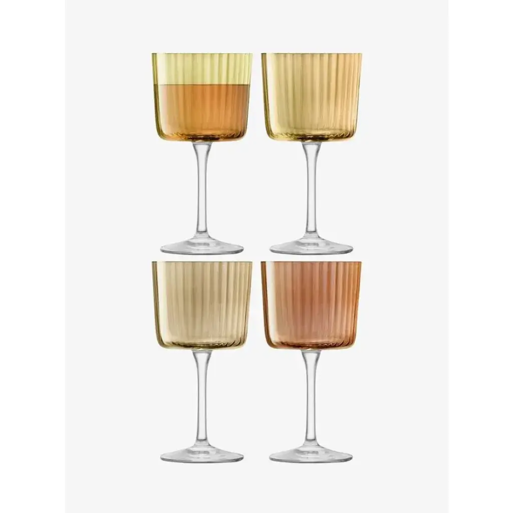 A set of textured wine glasses with fine walls, painted by hand in assorted tonal lustres.