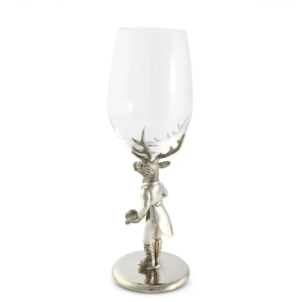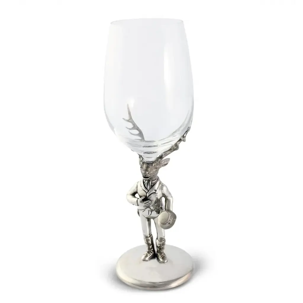 Celebrate holidays, special occasions or the end of the day with this whimsically elegant pewter wine glass. Our gentleman elk is finely dressed in equestrian attire and looking rather pleased to buck a luxurious, handblown crystal glass atop his antlers. Indulge his nonchalance with a generous pour of buttery Chardonnay, Cabernet Sauvignon or sparkling water. With many intricate details to be found, this exclusive artisan-designed wine glass is delightfully destined to entertain guests for years to come. Vagabond House is a family-owned American company specializing in fine pewter tableware, servingware and giftware. Largely inspired by nature, their exclusive products are designed to be unique, functional heirlooms for those who seek to express tradition and style in both family and formal entertaining.