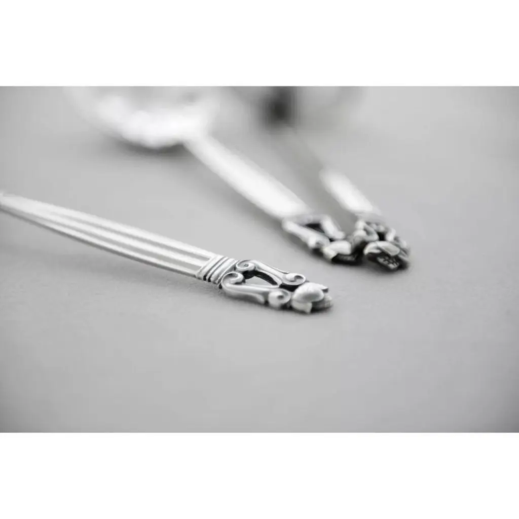 Vintage Georg Jensen sterling silver dinner spoon, item #011 in the Acorn Pattern, flatware design #62 by Johan Rohde from 1915.Additional information:Material: Sterling silverStyles: Art NouveauHallmarks: With Georg Jensen hallmark, made in Denmark.Dimensions: Measures 7 1/2″ (19.1cm) in length.Condition: Excellent vintage condition