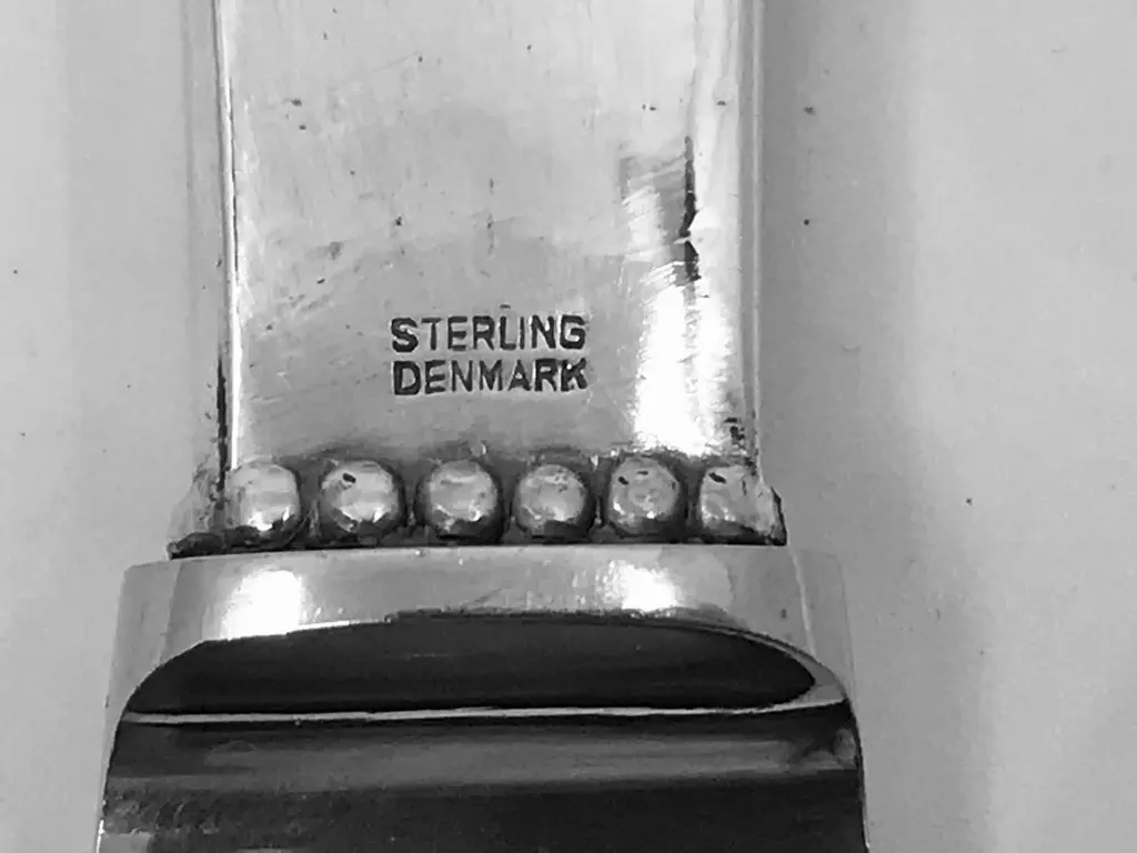 A Georg Jensen sterling silver dinner knife with stainless steel blade, the long handle version, item 014 in the Beaded pattern, design #7 by Georg Jensen from 1916.Additional information:Material: Sterling silver, stainless steelStyles: Art NouveauHallmarks: With Georg Jensen hallmark, made in Denmark.Dimensions: Measures 8 5/8″ (21.9cm) in length.Condition: Excellent vintage condition