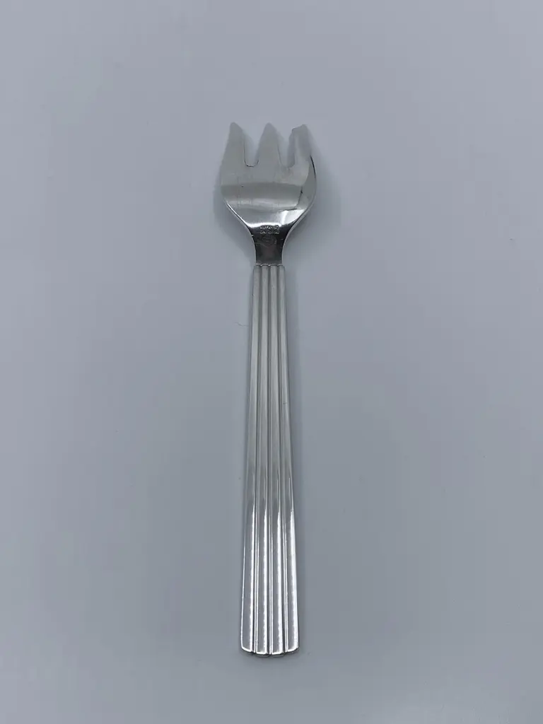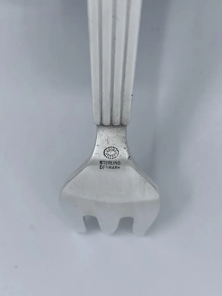04A Georg Jensen sterling silver cake fork, item #043 in the Bernadotte pattern, design #9 by Sigvard Bernadotte from 1939.Additional information:Material: Sterling silverStyles: Art DecoHallmarks: With Georg Jensen hallmark, made in Denmark.Dimensions: Measures 5 3/8″ (13.7cm) in length.Condition: Excellent vintage condition