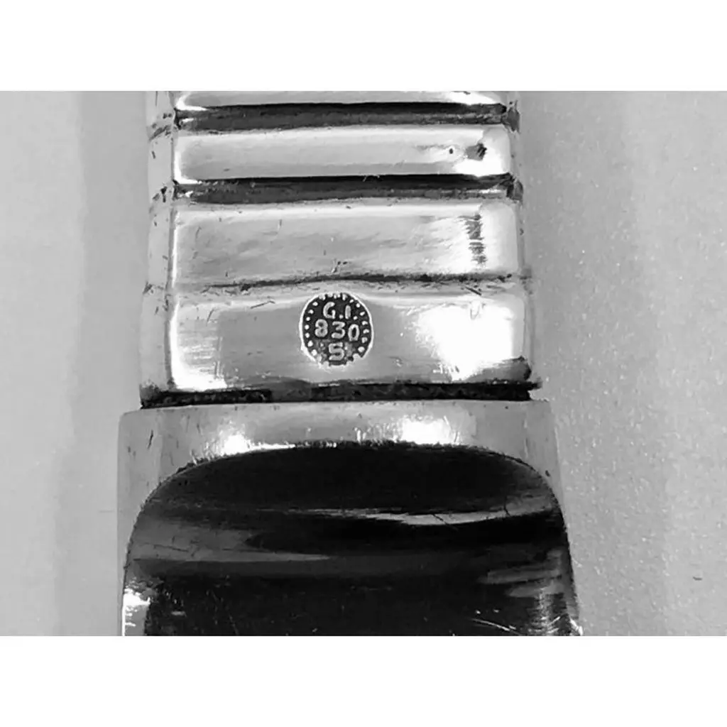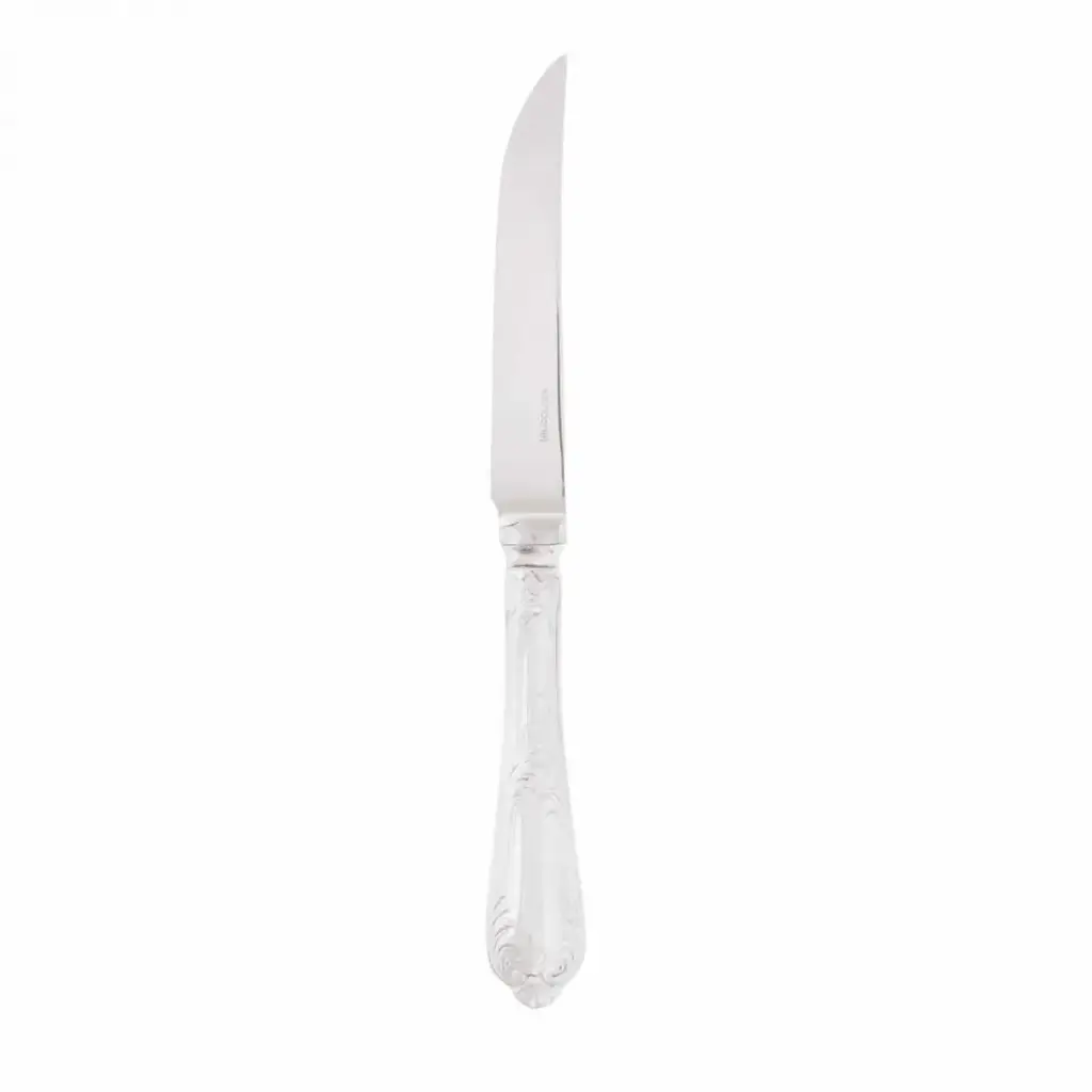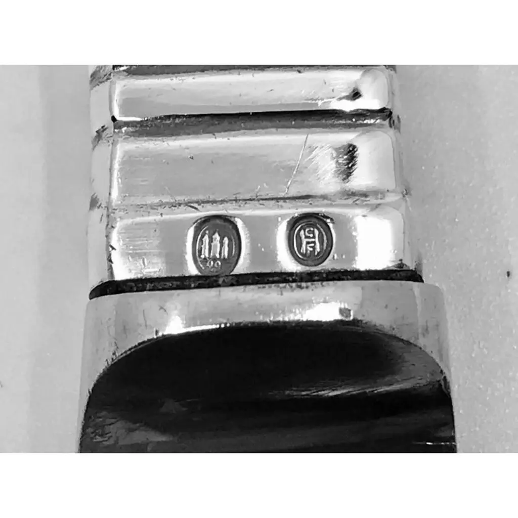 This is a large Georg Jensen dinner knife with silver handle and stainless steel blade, item 003 in the Continental pattern design #4 by Georg Jensen from 1906.Additional information:Material: Sterling silverStyles: Art NouveauHallmarks: With Georg Jensen hallmark, made in Denmark.Dimensions: Measures 9 5/8″ (24.6cm) in length.Condition: Excellent vintage condition