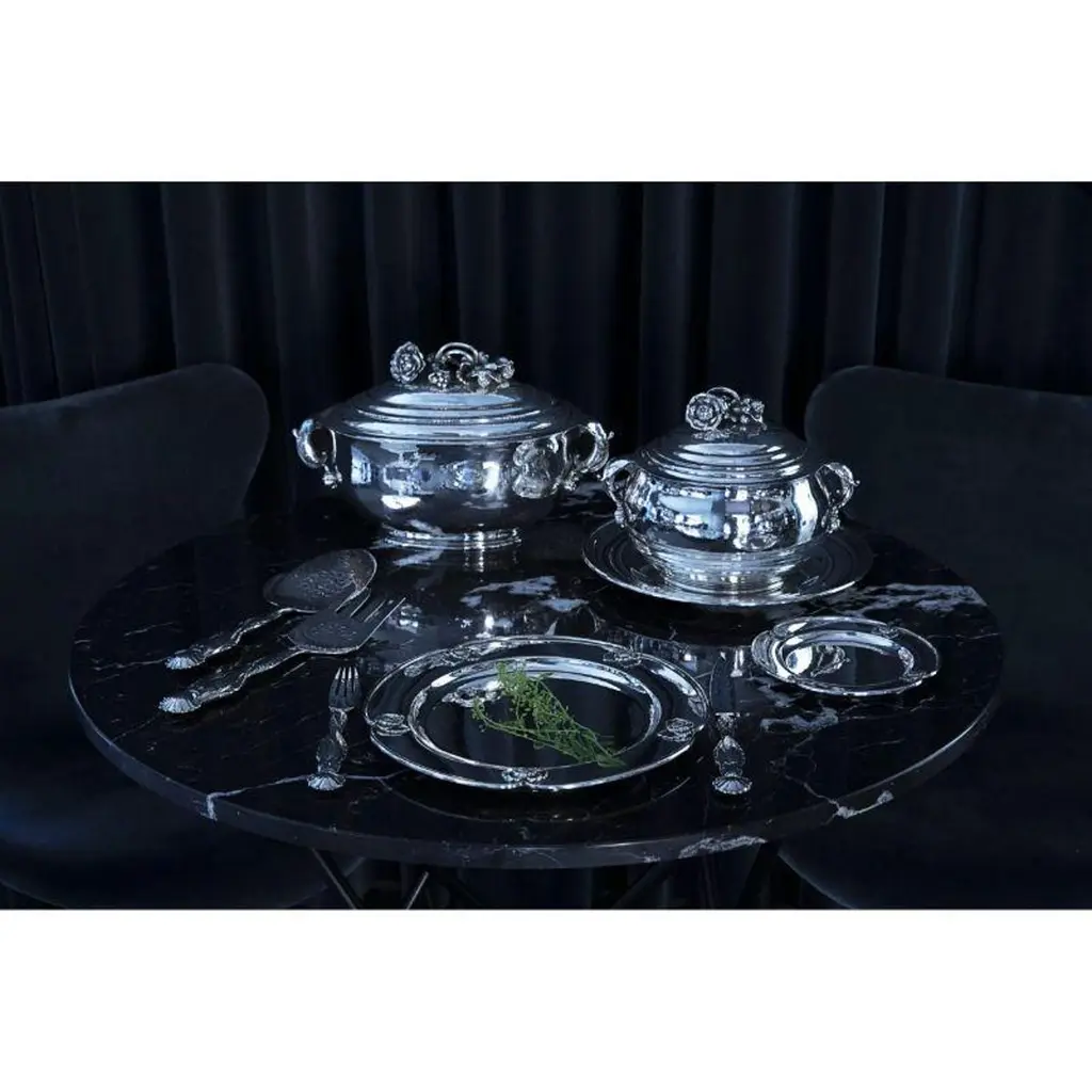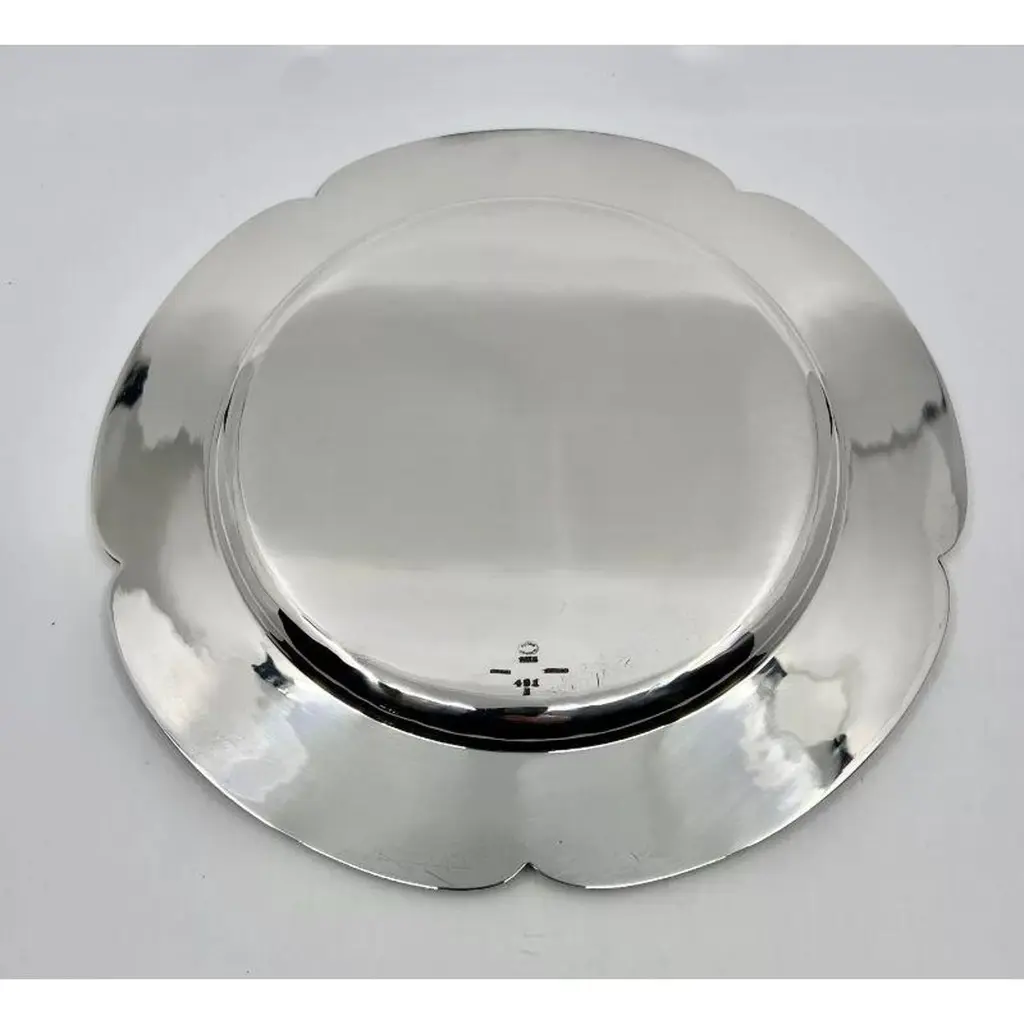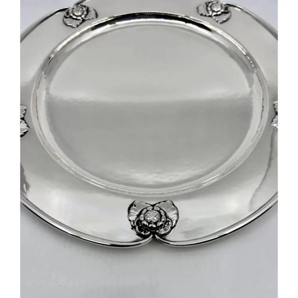The rare Georg Jensen charger plate from circa 1927 is a sterling silver masterpiece. Design #491B showcases intricate floral motifs with visible hand-hammering. Its heavy, high-quality construction and curved edges surrounding the flowers exhibit expert craftsmanship. These plates are extremely difficult to create, requiring meticulous handcrafting. A coveted collector’s item, it epitomizes Georg Jensen’s timeless elegance and artistic legacy.Additional information:Material: Sterling silverStyles: Art NouveauHallmarks: With vintage Georg Jensen hallmarks from the 1930s.Dimensions: 10 3/8″ (26.5cm) in diameter.Weight: 622 grams (21.94 oz.)Condition: Excellent vintage condition