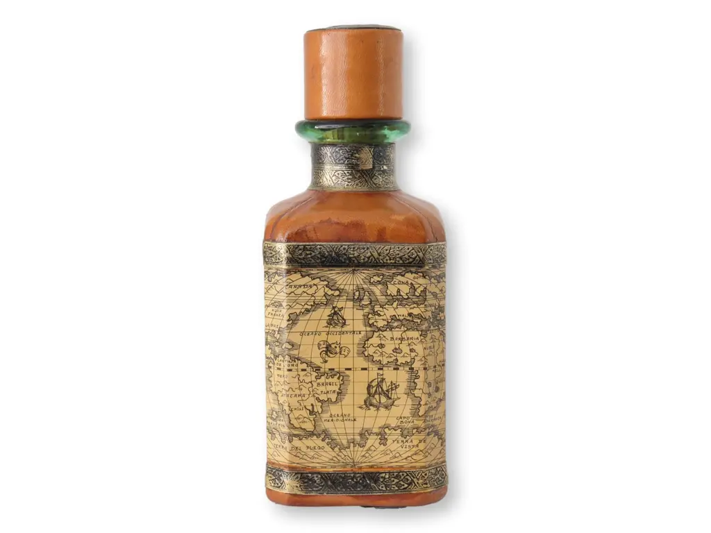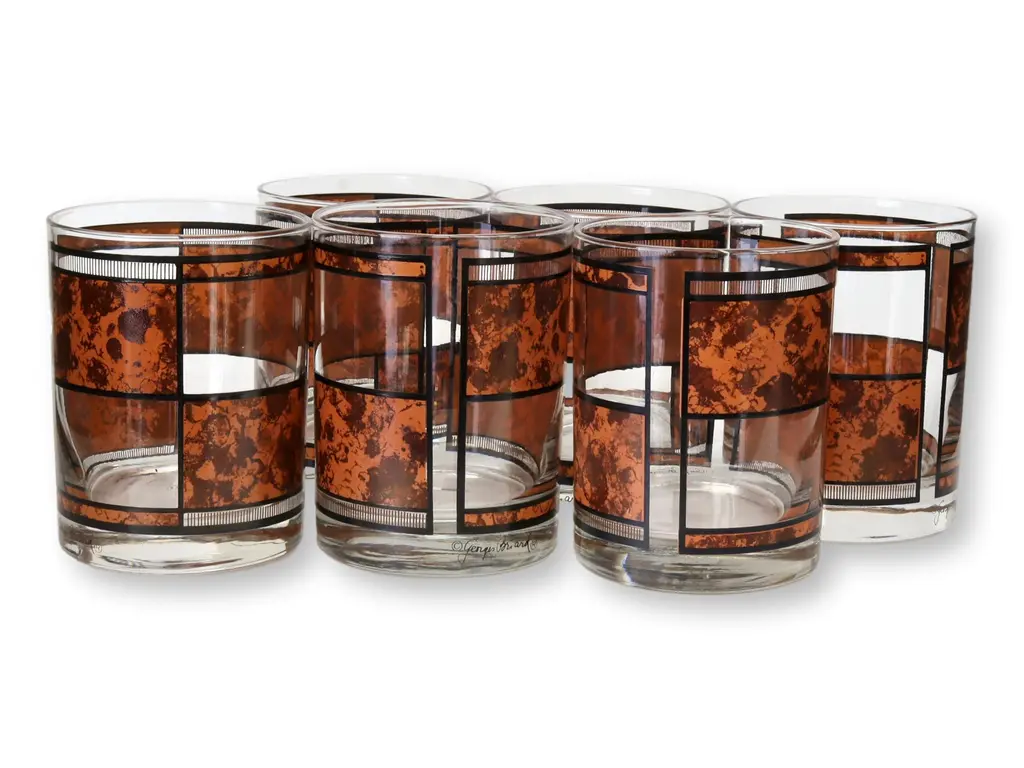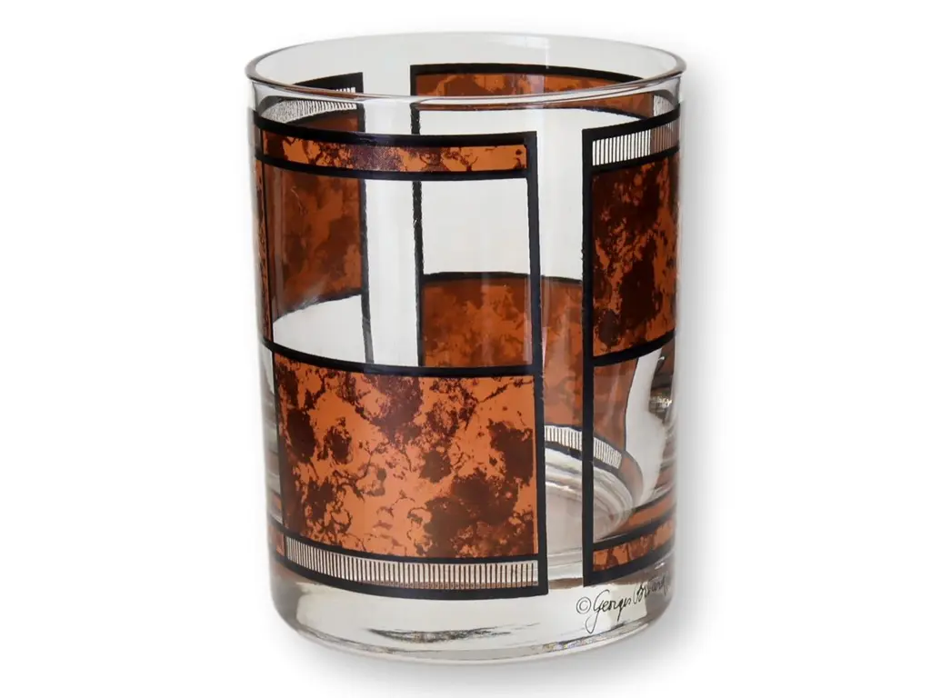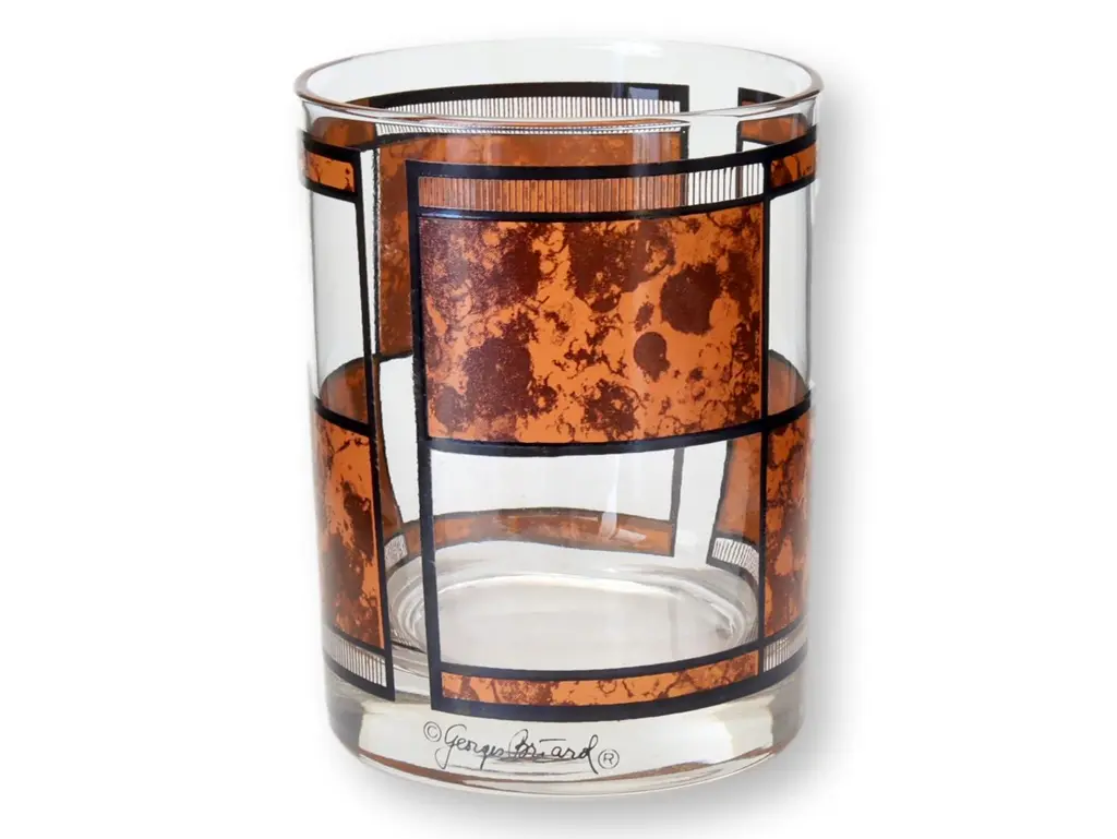 Elevate your bar collection with these George Briard glasses, showcasing a signature mix of bold patterns and quality. Dimensions: 6 glasses, 3"Dia x 4"H; decanter, 3.75"L x 3.75"W x 9.75"H. Paired with a leather-wrapped decanter, it's a luxurious set that blends functionality with high design. Perfect for the wanderlust entertainer. Glasses are signed.